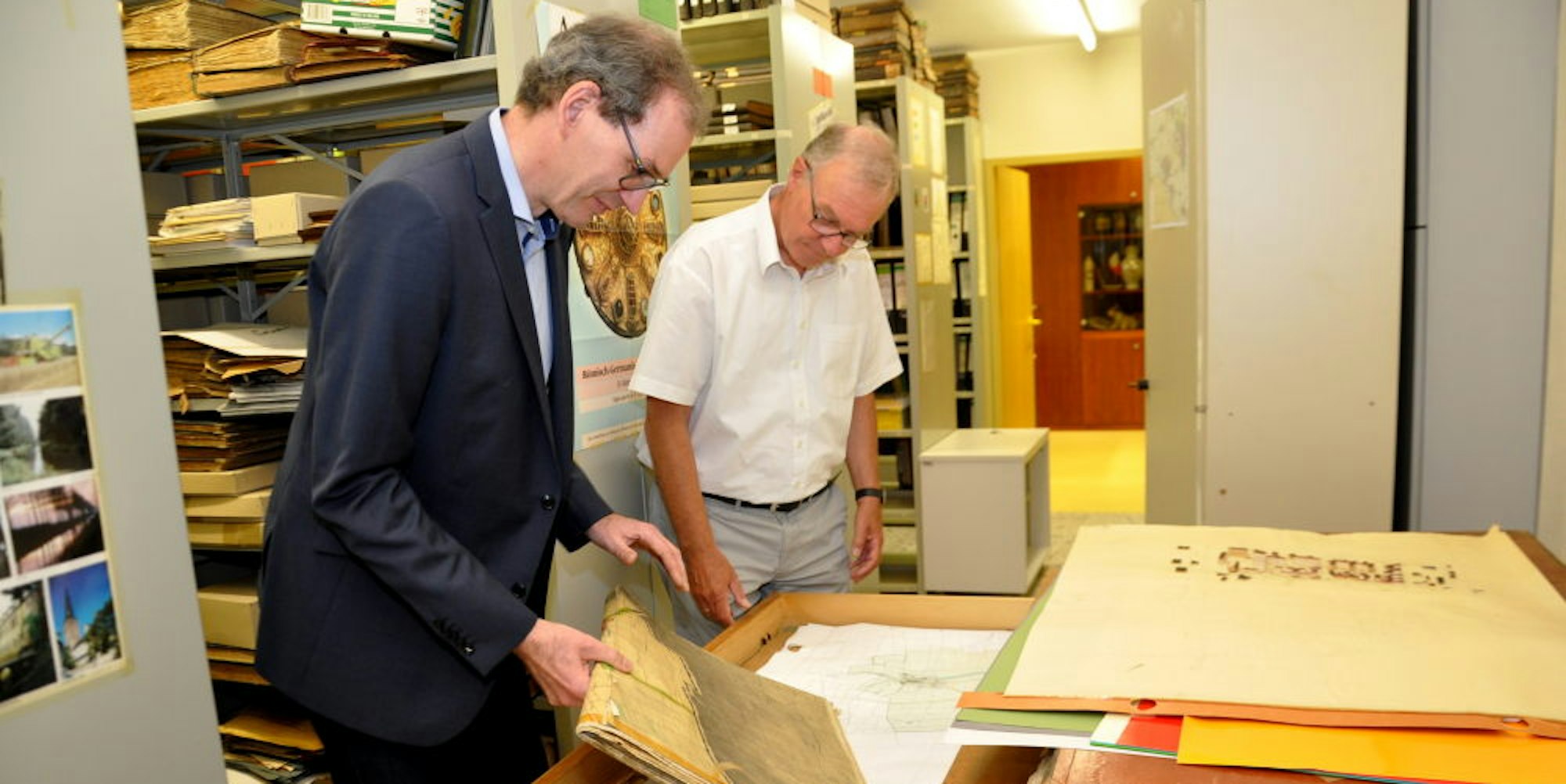 Alte Karten und Dokumente des Stadtarchivs sichten Archivar Christoph Hoischen (r.) und sein Nachfolger Thomas Kreft.