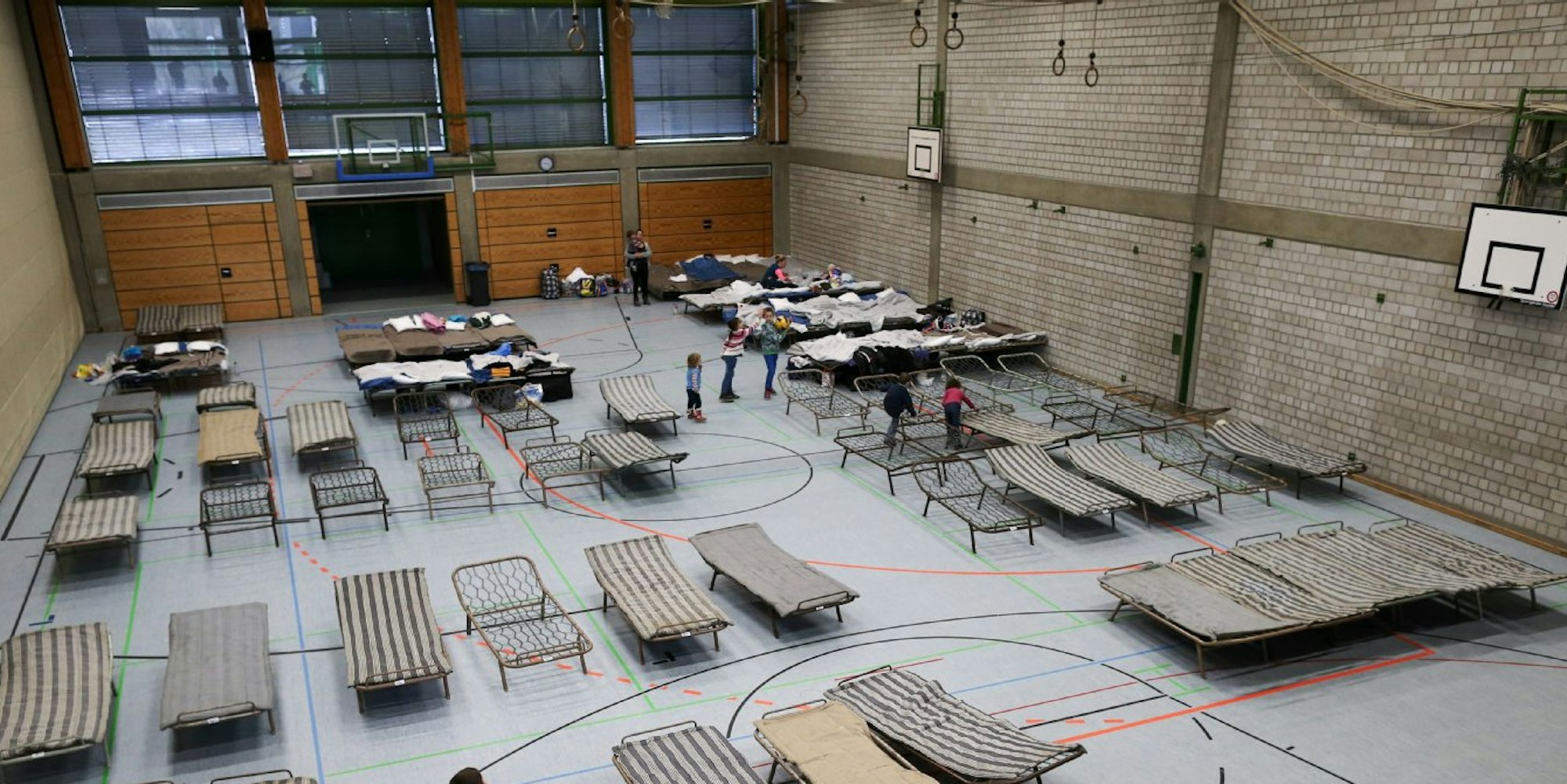 Seit vielen Wochen leben in der Halle am Angelsdorfer Schulzentrum weniger als 50, aktuell nur 38, statt der möglichen 150 Menschen. Dennoch denkt die Verwaltung zurzeit nicht über eine Räumung der Halle und die Rückgabe an die örtlichen Sportvereine nach. „Das wäre zu riskant“, sagt Stadtsprecher Robert Wassenberg. Schließlich könnten kurzfristig weitere Flüchtlinge nach Elsdorf geschickt werden. Und auch für weitere zugewiesene Asylbewerber gebe es keinen Wohnraum mehr innerhalb des Stadtgebiets, sodass auch dafür die Halle in Reserve bleiben müsse. Wie lange, wisse aktuell niemand, sagt Robert Wassenberg.