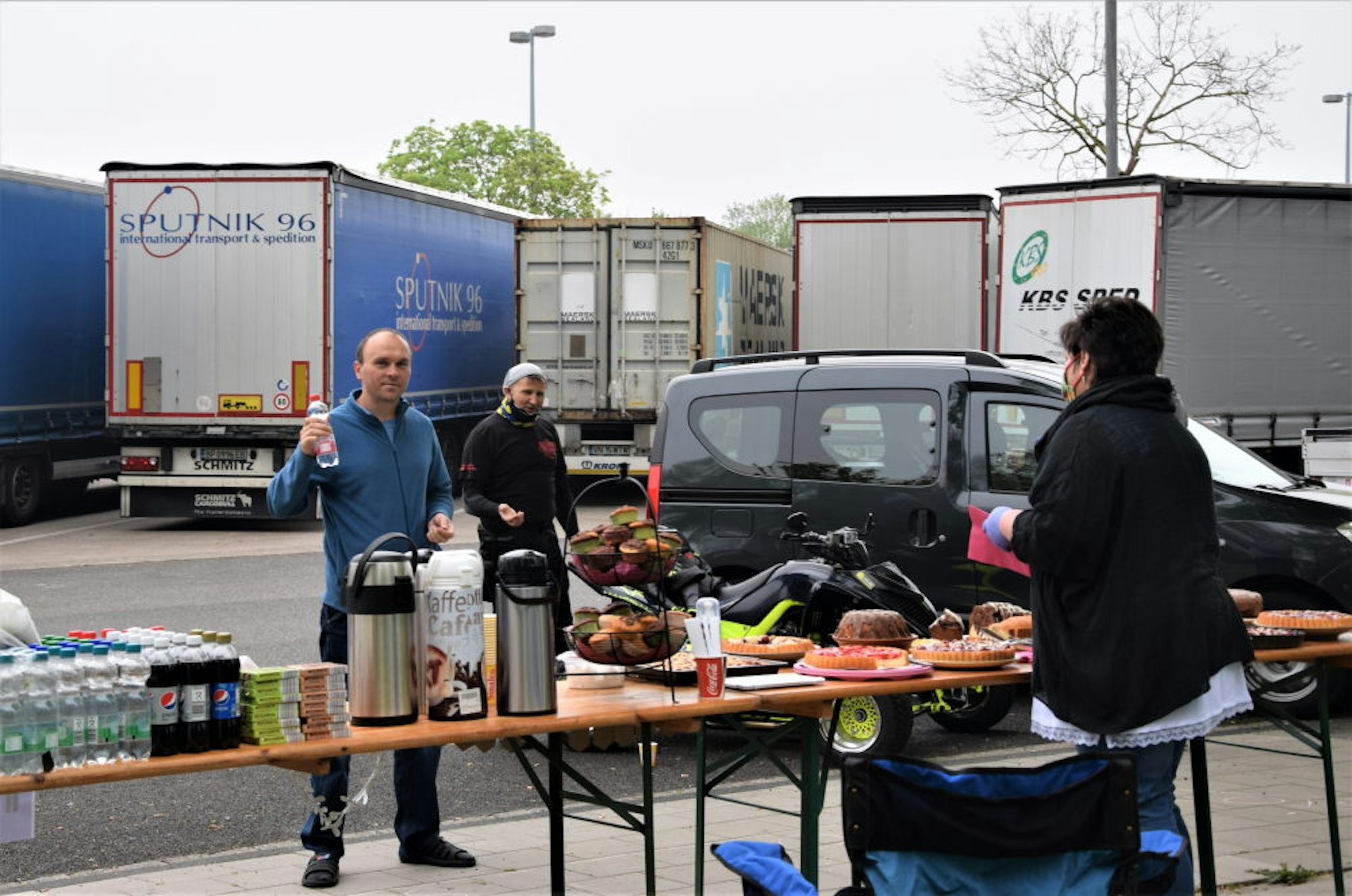 Gegen Mittag entdeckten erste Fahrer den Tisch und freuten sich über ein Stück Erdbeertorte. „Das ist schön“, bedankte sich Stefan Puiu, der mit seinem Kollegen aus Ploiesti in Rumänien kommt. „Wir kommen gerade aus Holland und wollen morgen dorthin zurück“, erzählte er auf Englisch. „Es gab keine Wartezeiten an der Grenze, und wir fühlen uns hier auch sicher“, berichtete er. Weitere Fahrer, unter anderem aus Polen und der Ukraine, kommen nach und nach an den Tisch und freuen sich über die süßen Speisen. In ihren 40-Tonnern transportierten sie Rohöl, Papier und Autos.
