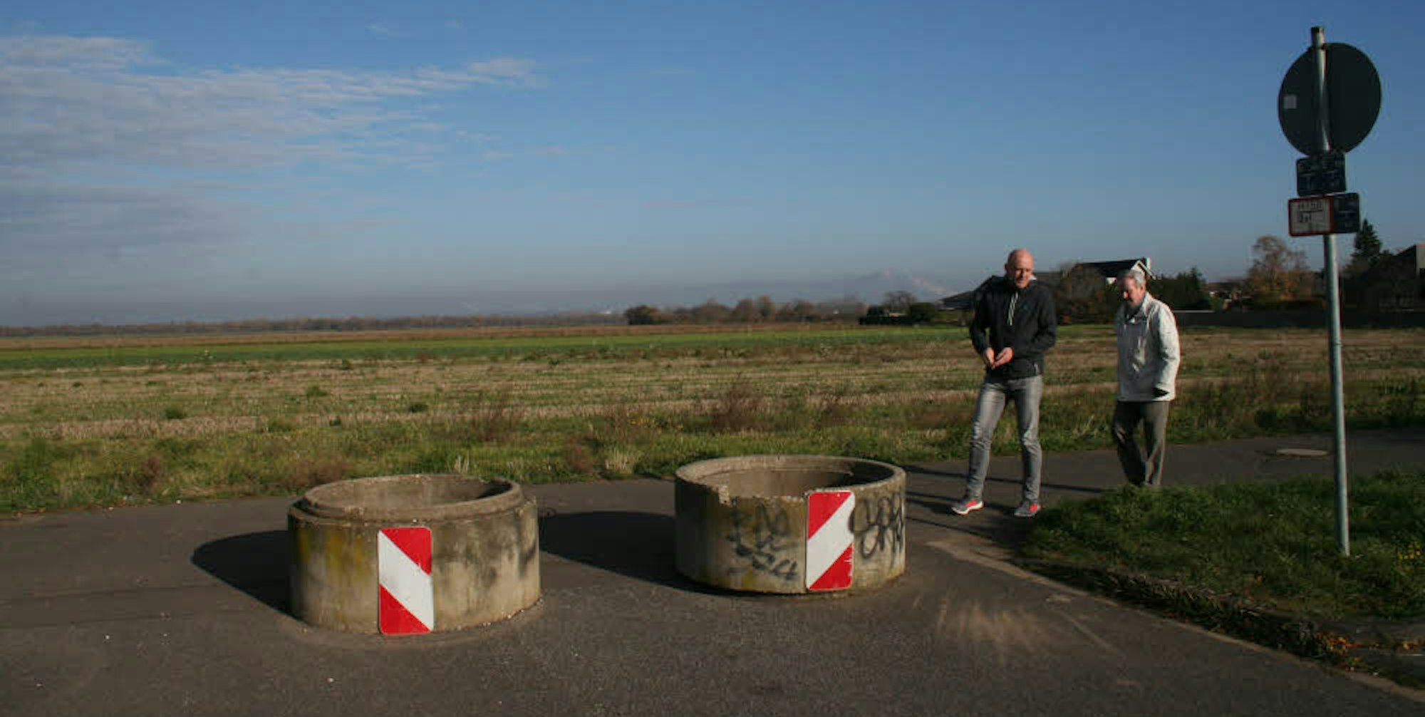 Noch endet die Straße Zur alten Burg an den beiden Betonröhren. Gegen die Pläne für das Gebiet dahinter wollen Peter Germelmann (l.) und Friedrich Caspers notfalls klagen.