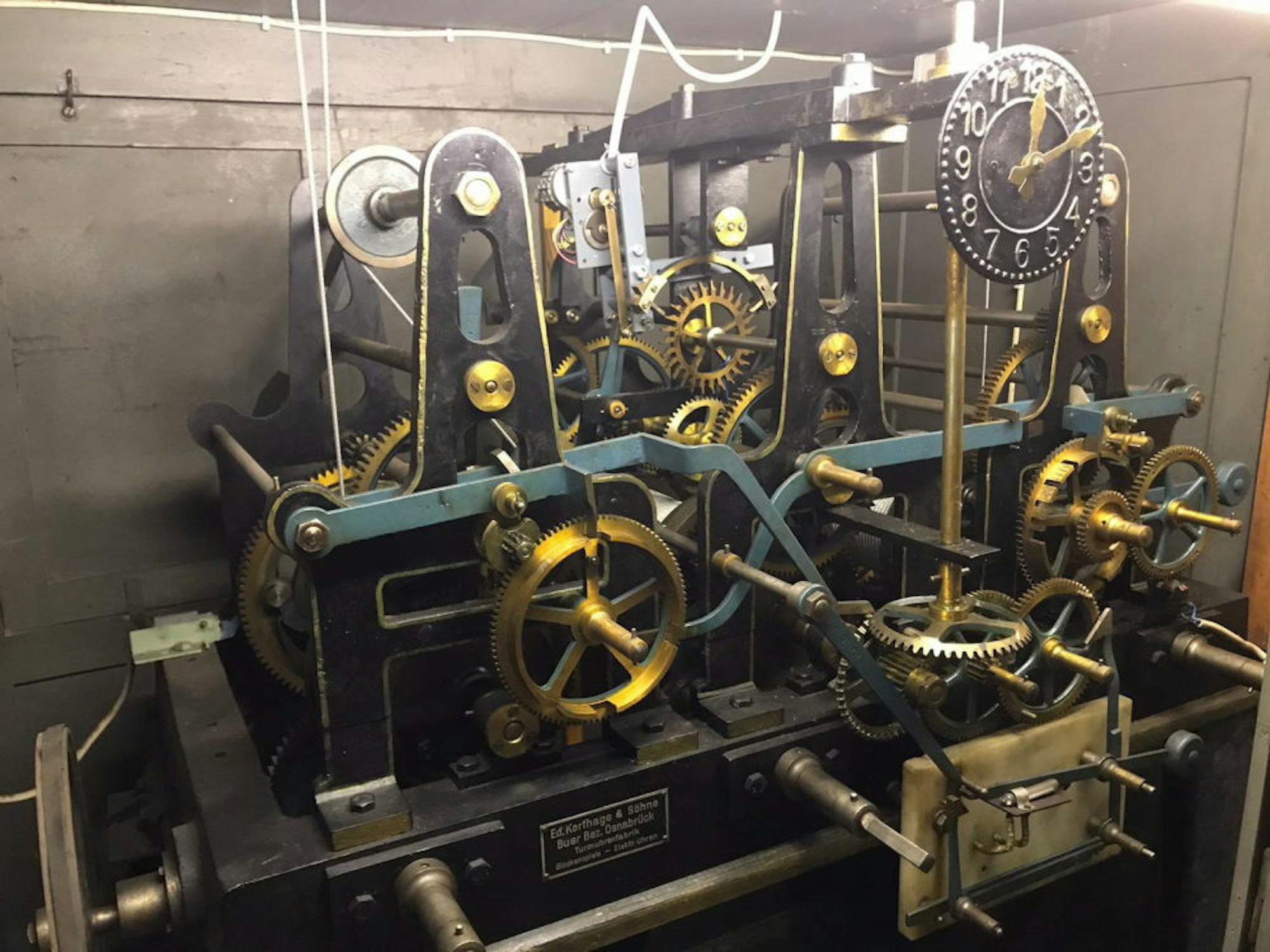 Das Werk der Kirchturmuhr läuft wieder. Durch Glastüren kann man die komplizierte Mechanik sehen.