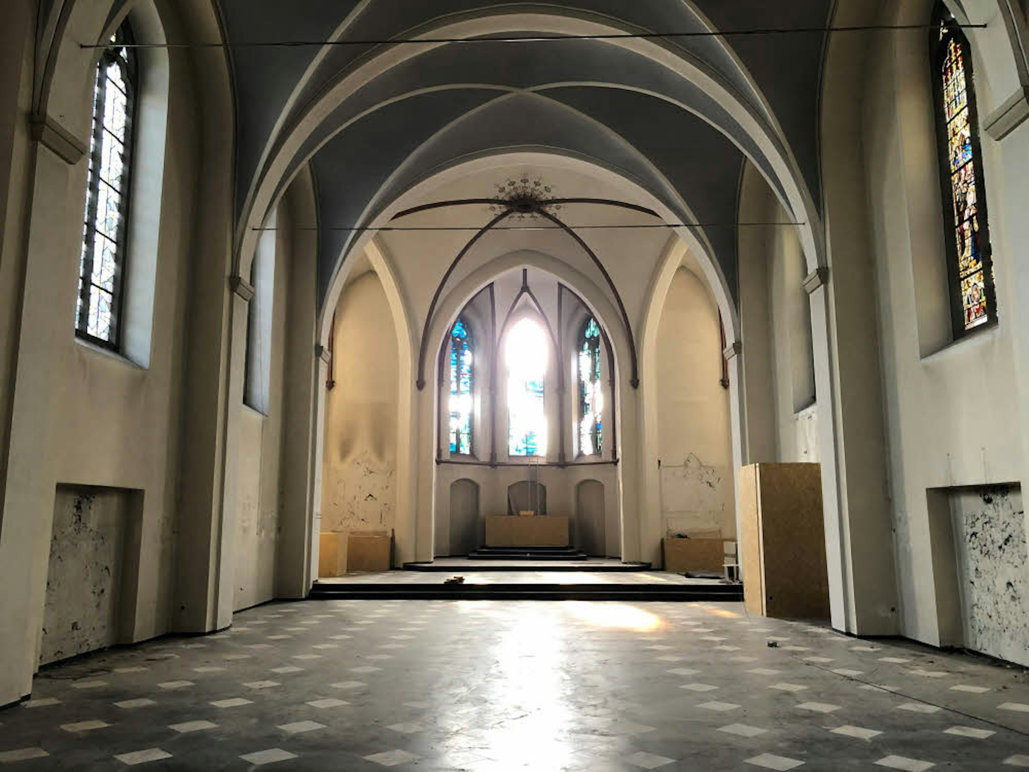 Leer geräumt ist das Kircheninnere. Leitungen werden verlegt, Schadstellen beseitigt und alles gestrichen.