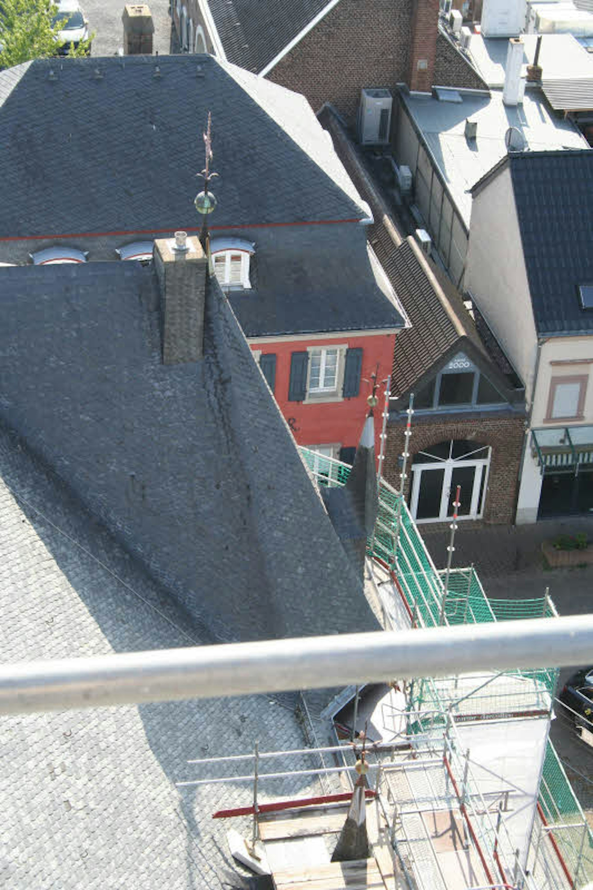 Wer dicht dabei sein möchte, muss schwindelfrei sein. Den ersten Teil des Aufstiegs kann man noch bequem im Aufzug hinter sich bringen, dann geht es über schmale Leitern weiter hinauf. Neben Heinz Grimberg, einem der fünf Mann im Bauausschuss des Kirchenvorstands, wagt auch Monika Hallstein, die Technische Beigeordnete der Stadtverwaltung, den Ausflug auf 37 Meter Höhe.