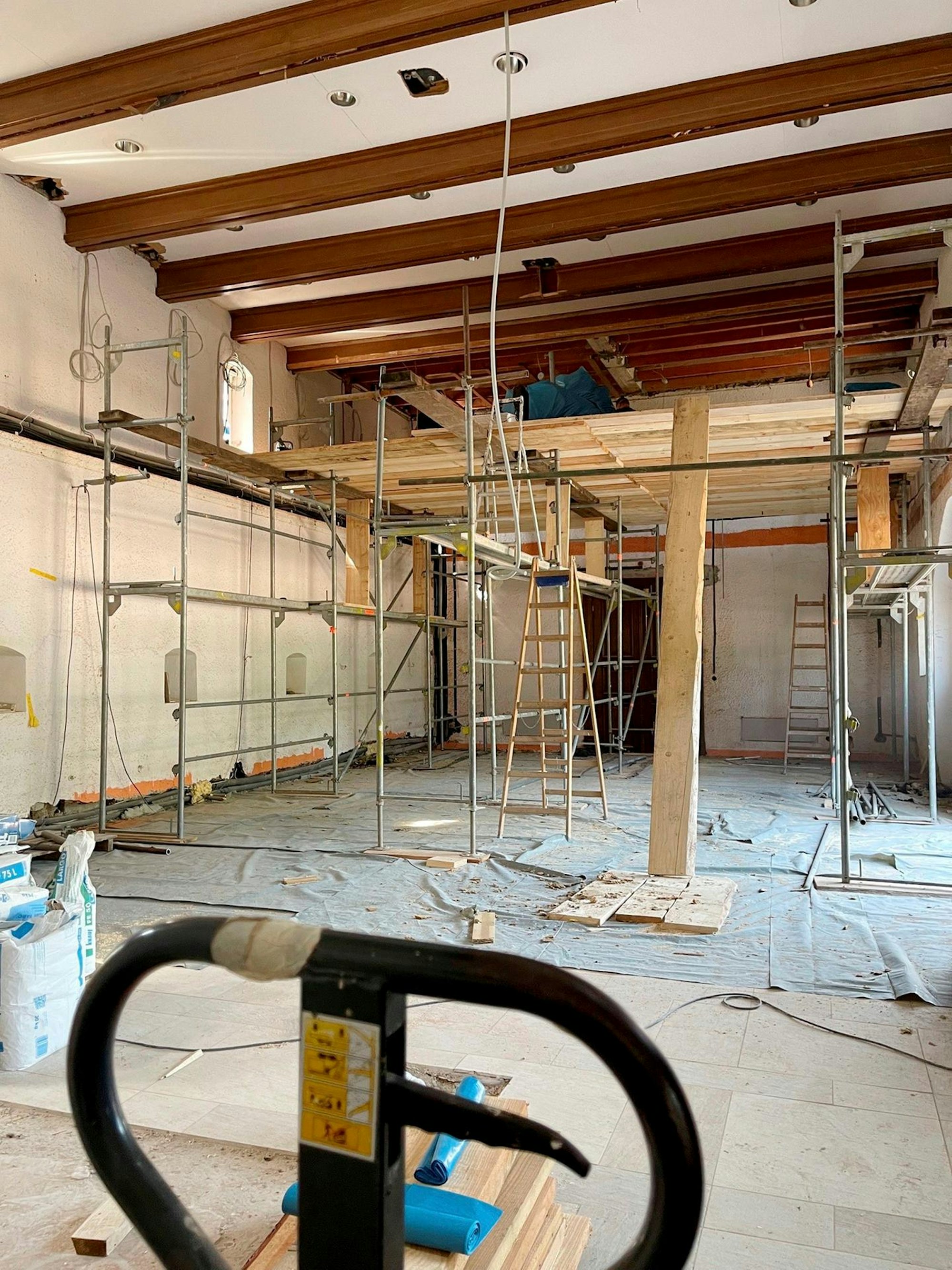 Im gegenüberliegenden Gebäude wird der ehemalige Bundespressesaal saniert und für größere Konferenzen und ähnliches vorbereitet. Die alte Decke wird abgenommen und neu gedämmt. Sofern Baumaterial verfügbar ist, denn die Baustelle leidet unter dem allgemeinen Materialmangel im Bausektor. Nur Holz fehlt nicht – da werden die vielen gefällten Bäumen des Schlossparks verwendet. Glücklicherweise habe es im Team der Bauarbeiter keinen Corona-Fall gegeben, alle würden regelmäßig getestet, berichtet Overlack.