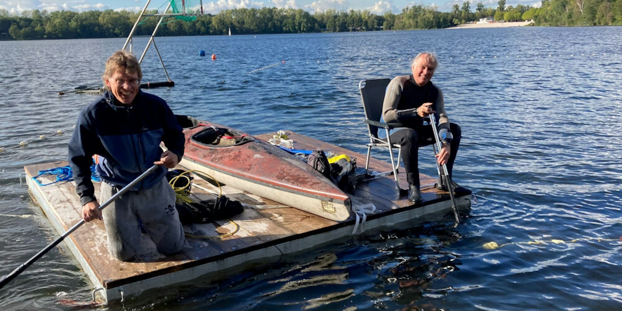 Auf einem Floß brachten Klaus Poppe (r.) und Ingo Mietens das zweisitzige Kanu an Land. Seit dem vorigen Jahr ruhte es auf dem Grund des Sees.