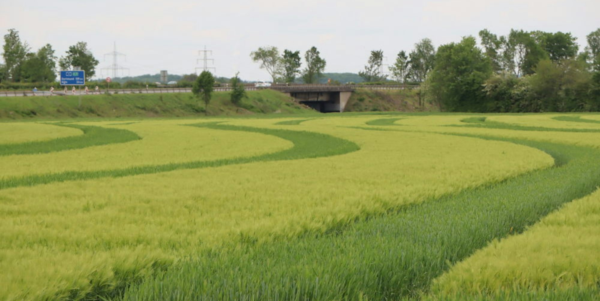 In sanften Bögen ziehen sich helle und dunklere Streifen über das Feld an der Autobahn.