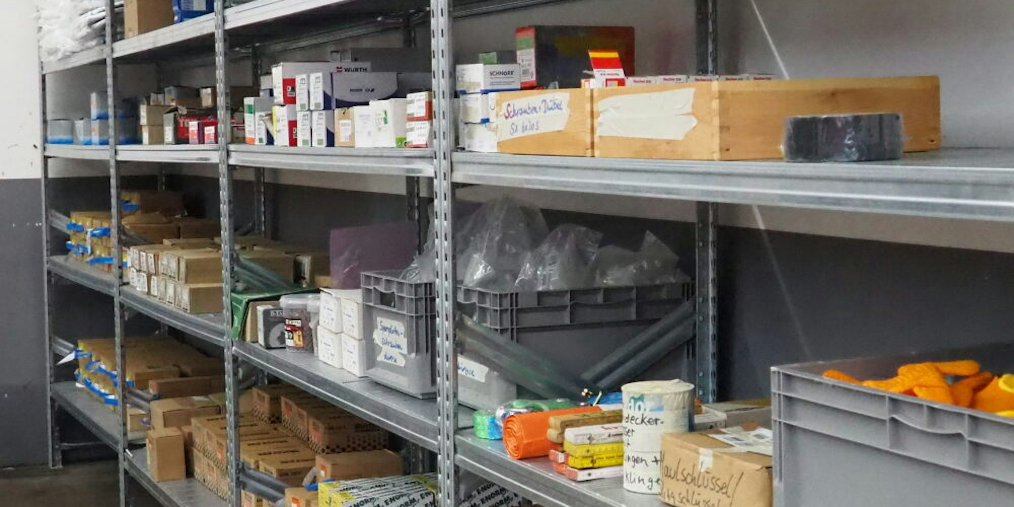 Das Regal mit Nägeln, Schrauben und anderen Kleinteilen ist schon ganz gut gefüllt.