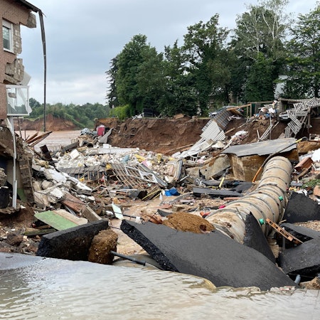 Das sei beileibe kein Skandal, sondern ein ganz normaler Vorgang. Denn das Dach der Reithalle, die bei der Flutkatastrophe beschädigt worden war und bereits abgebrochen ist, sei mit Eternitplatten gedeckt gewesen, ebenso eine Garage. Und in diesem Fall sei das Bauunternehmen gesetzlich verpflichtet, vor Asbest zu warnen. Der gesundheitsschädliche Stoff sei aber in den Dachplatten fest gebunden. „Ein Gutachter war da“, sagte Küsters, „und hat bestätigt, dass keine Gefahr besteht.“
