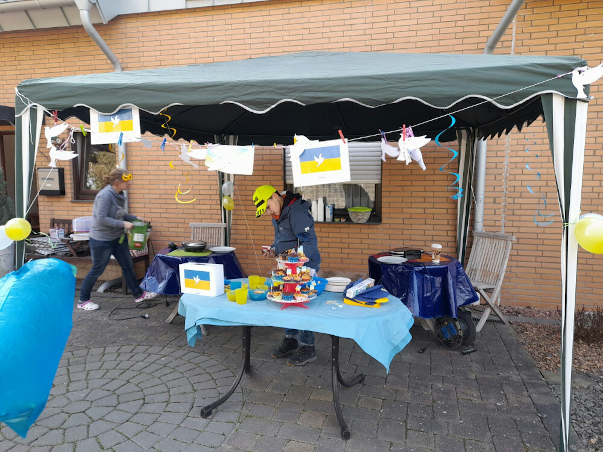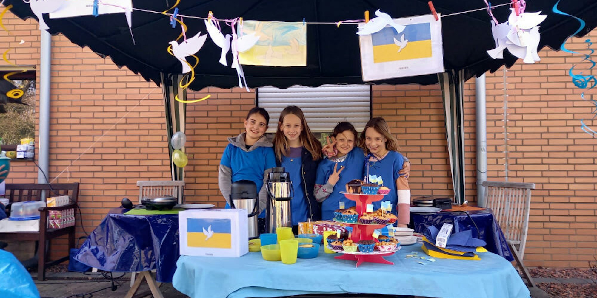 „Dann steckt mal die Köpfe zusammen und lasst euch etwas einfallen“, empfahlen die Eltern. Was die Kinder dann auf die Beine gestellt haben, überraschte sie aber doch. Eine Woche lang schrieben die Neunjährigen fleißig von Hand Flyer, die dann in der Schule verteilt wurden. Vor dem Haus von Familie Ley in Erp sollte der Stand aufgebaut werden. Ein Pavillon musste her – der Großvater eines Kindes hat einen. Das Zelt musste dekoriert werden – also wurden Friedenstauben und Ukraineflaggen gebastelt. Auch die Servietten sollten blau-gelb sein – dafür musste ein Vater seinen Geschenkgutschein vom Geburtstag spendieren.