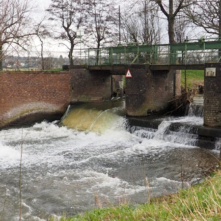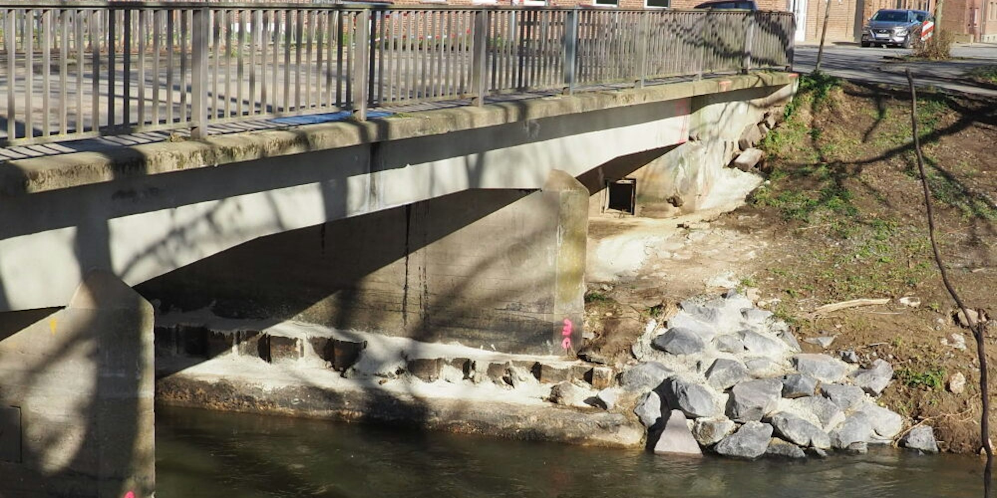 Unter der Brücke hat der Erftverband nach der Flutkatastrophe das Ufer mit Wasserbausteinen befestigt. „Das war eine Sofortmaßnahme“, erklärt Dirk Schulz. Die Befestigung muss später auch erneuert werden, weil das Bauwerk demnächst komplett abgerissen wird. Beim Neubau werden Erfahrungen aus dem extremen Hochwasser einfließen. Der Fluss soll unter der Brücke mehr Platz bekommen, um für kommende Starkregenereignisse besser gerüstet zu sein,