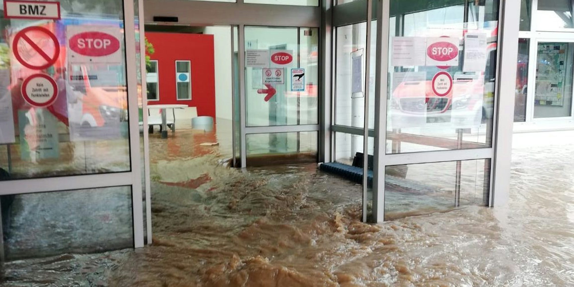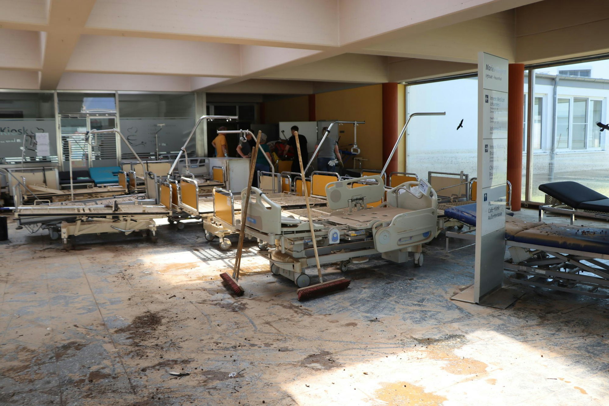 Inzwischen ist die braune Brühe, die das Krankenhaus am Donnerstag vergangener Woche überflutet hatte, abgelaufen. Wie ein schmutziger Mantel hat sich der matschige Dreck auf das gesamte Inventar, auf die Gerätschaften, den Böden und in den Patientenzimmer ausgebreitet. Das einst so freundlich wirkende helle Foyer ist verwüstet. Wie hoch das Wasser in der Klinik gestanden hat, lässt sich an den schwarz schimmernden Kanten an den Wänden, Türen und Möbeln der Klinik ablesen. „Ich bin heilfroh, dass hier niemand zu Schaden gekommen ist“, sagt Schall.