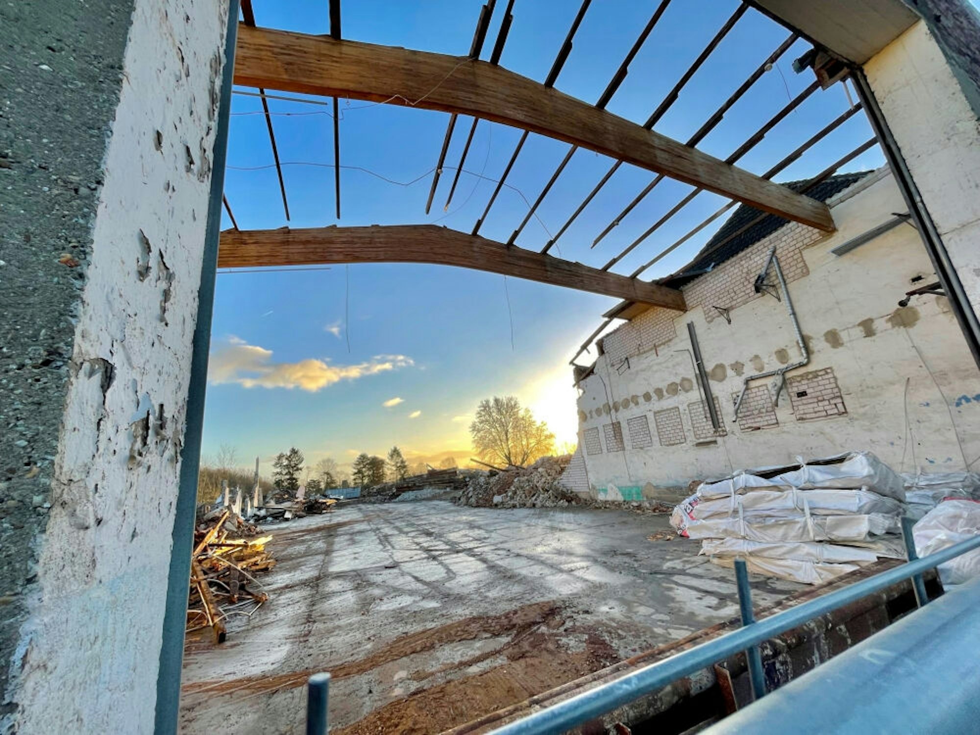 Durch die große Toreinfahrt an der Frenzenstraße fällt der Blick auf das Gelände, wo die Abbrucharbeiten in vollem Gang sind.