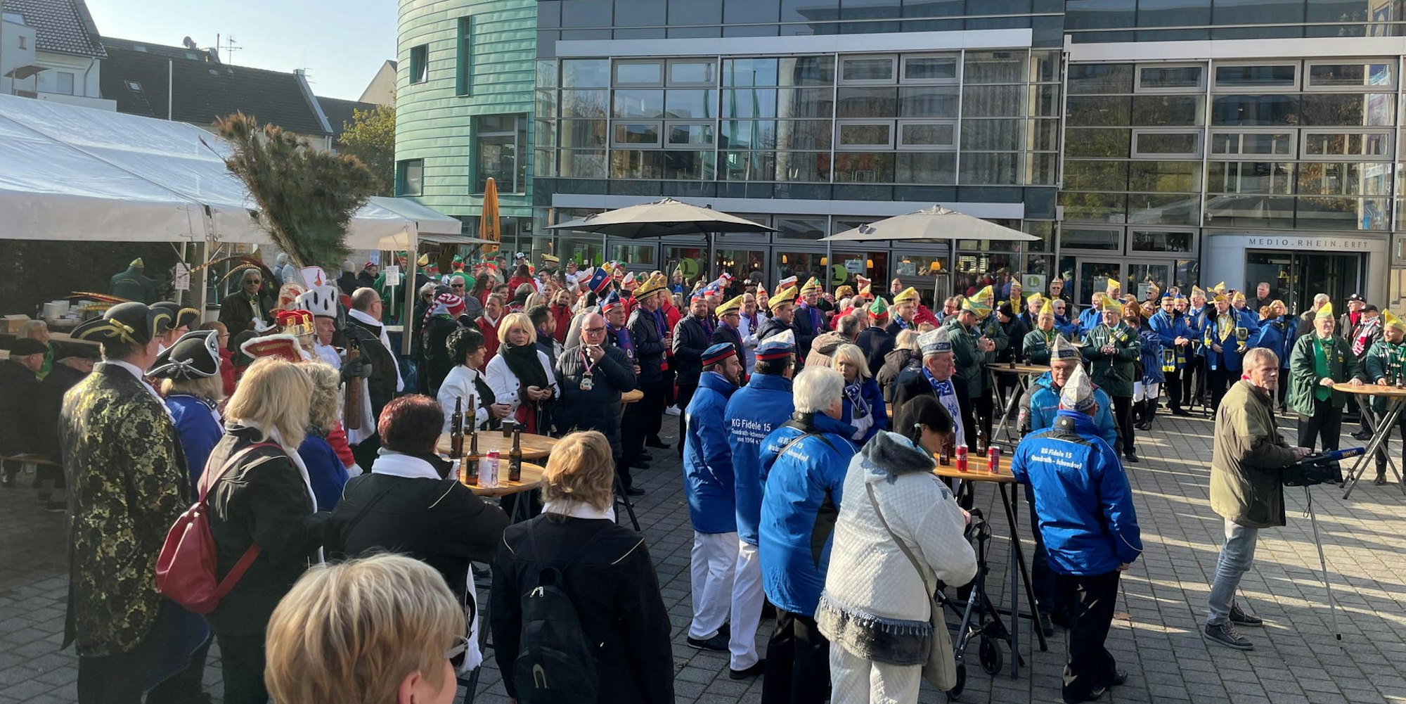 Rhein-Erft-Kreis – Es fühlt sich vertraut an, ist aber doch irgendwie anders. Auch im Rhein-Erft-Kreis feierten die Jecken am Elften im Elften um 11.11 Uhr den Start in die fünfte Jahreszeit. Doch ganz so unbeschwert wie vor der Pandemie sei es noch nicht, gab Bergheims Bürgermeister Volker Mießeler auf der Bühne auf dem Konrad-Adenauer-Platz zu, bevor er den Countdown zählte und um Punkt 11.11 Uhr und elf Sekunden die neue Session ausrief. „Hier gelten jetzt die vier J“ – Jeimpft, jenesen, jetestet und jeck“.