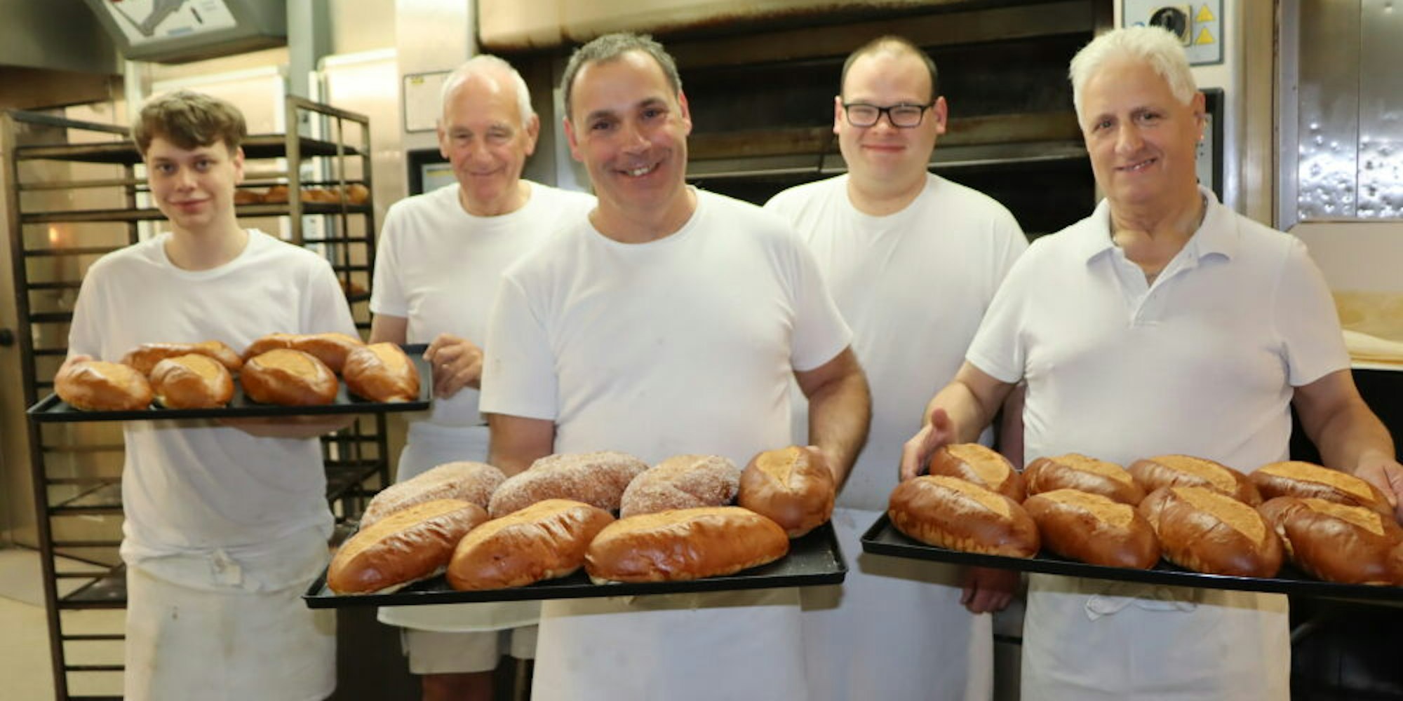 Das Team um Inhaber Peter Weber (vorne links) spendet handgemachte Wecken für die Flutopfer.