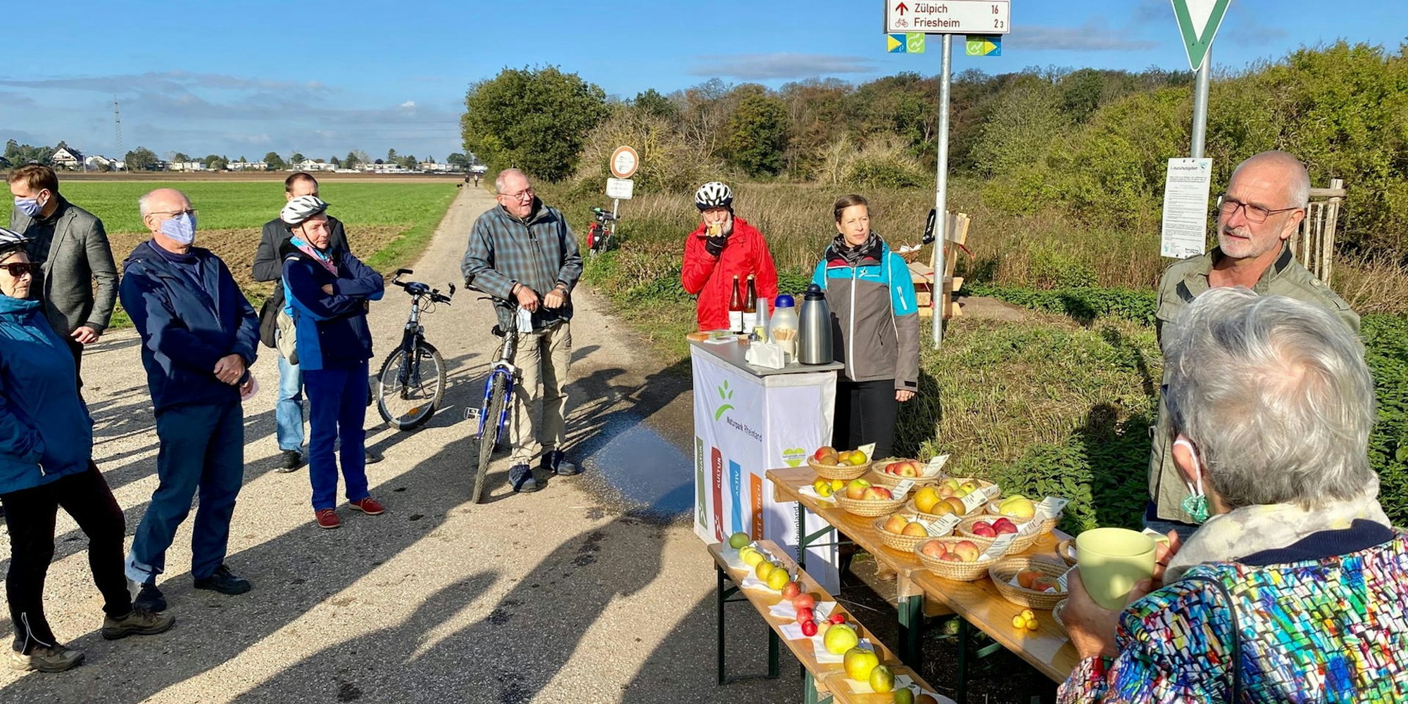 Ein kostenloses Infoblatt mit Routenverlauf ist ab sofort in den Onlineshops in den Naturparkzentren erhältlich. Zudem gibt es für die ersten 111 Streuobstroutenradler im Erftmuseum am Naturparkzentrum Gymnicher Mühle ein schönes Paket, unter anderem mit Trinkflasche und Fahrrad-Flickzeug. Das war den Test-Radlern am Eröffnungstag schon mal sicher. Zu ihnen gehörte auch Karl tho Pesch vom ADFC. „Den Weg kann man entspannt fahren. Auf zwei Villehängen gibt es herrliche Ausblicke.“
