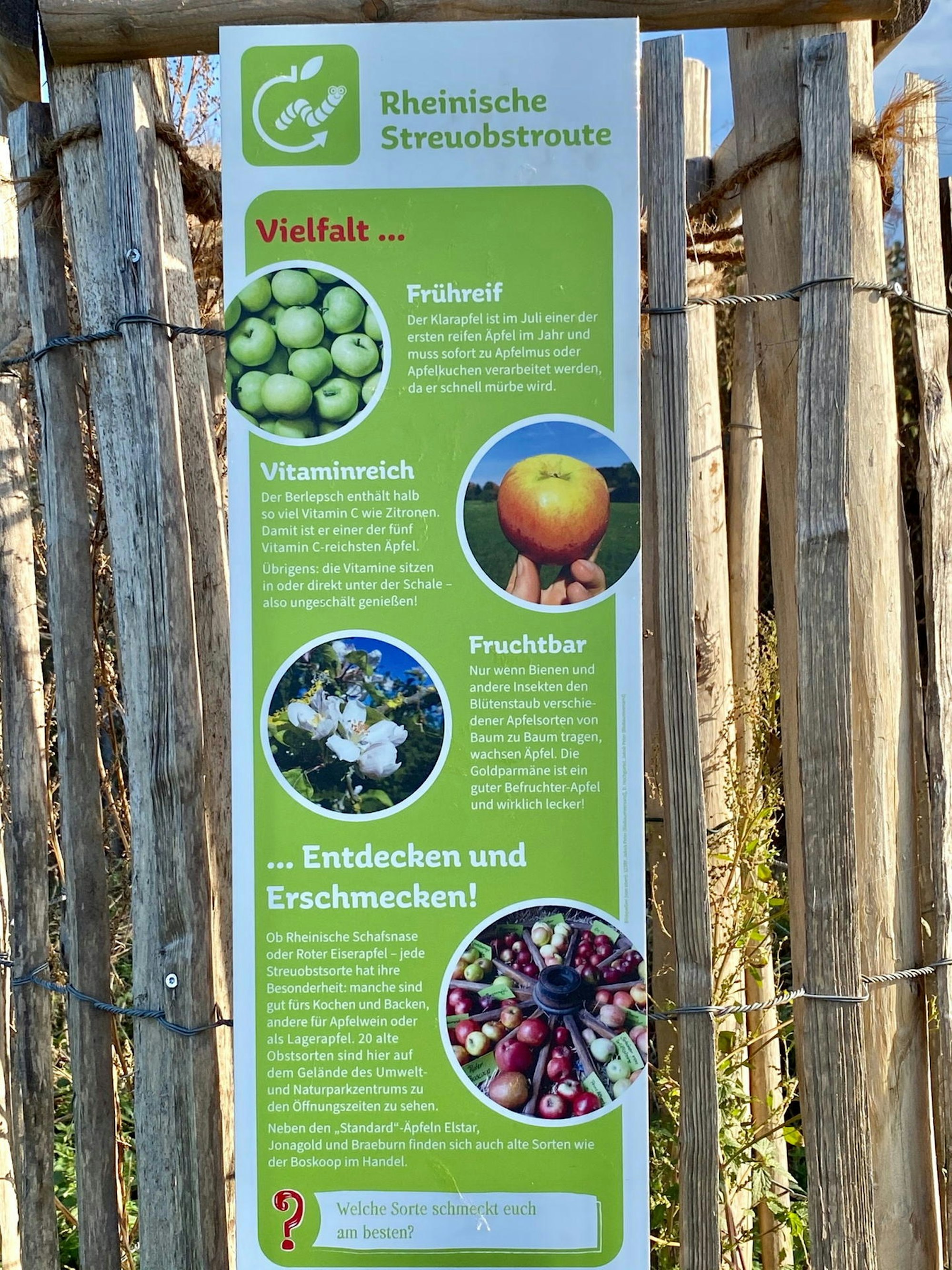 Die „Rheinische Streuobstroute“ sei familienfreundlich angelegt, „so dass auch Eltern mit jüngeren Kindern daran Freude haben“, erläuterte die Projektleiterin der Tour, Miriam Sabo. Auf dem Rundweg gibt es insgesamt neun Rast-Stationen, die mittels einer Tafel über die Streuobstwiesen informieren. Beispielsweise darüber, wo und wie sie früher rund um die Ortschaften angelegt wurden, um die Bevölkerung zu versorgen. Durch den wirtschaftlichen Obst-Anbau in Form von Plantagen wurden sie jedoch verdrängt. Immer mehr Verbände und Vereine machen sich inzwischen für den Erhalt stark.