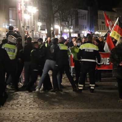 Wie jeden Montag zuvor auch werden die Corona-Leugner von Polizisten begleitet. Zwar war das Treffen nicht angezeigt worden, wie es das Versammlungsgesetz vorschreibt, aber die Beamten halten trotzdem ein wachsames Auge auf die Gruppe. Andere Polizistinnen und Polizisten sind unweit dieses Treffens im Einsatz.