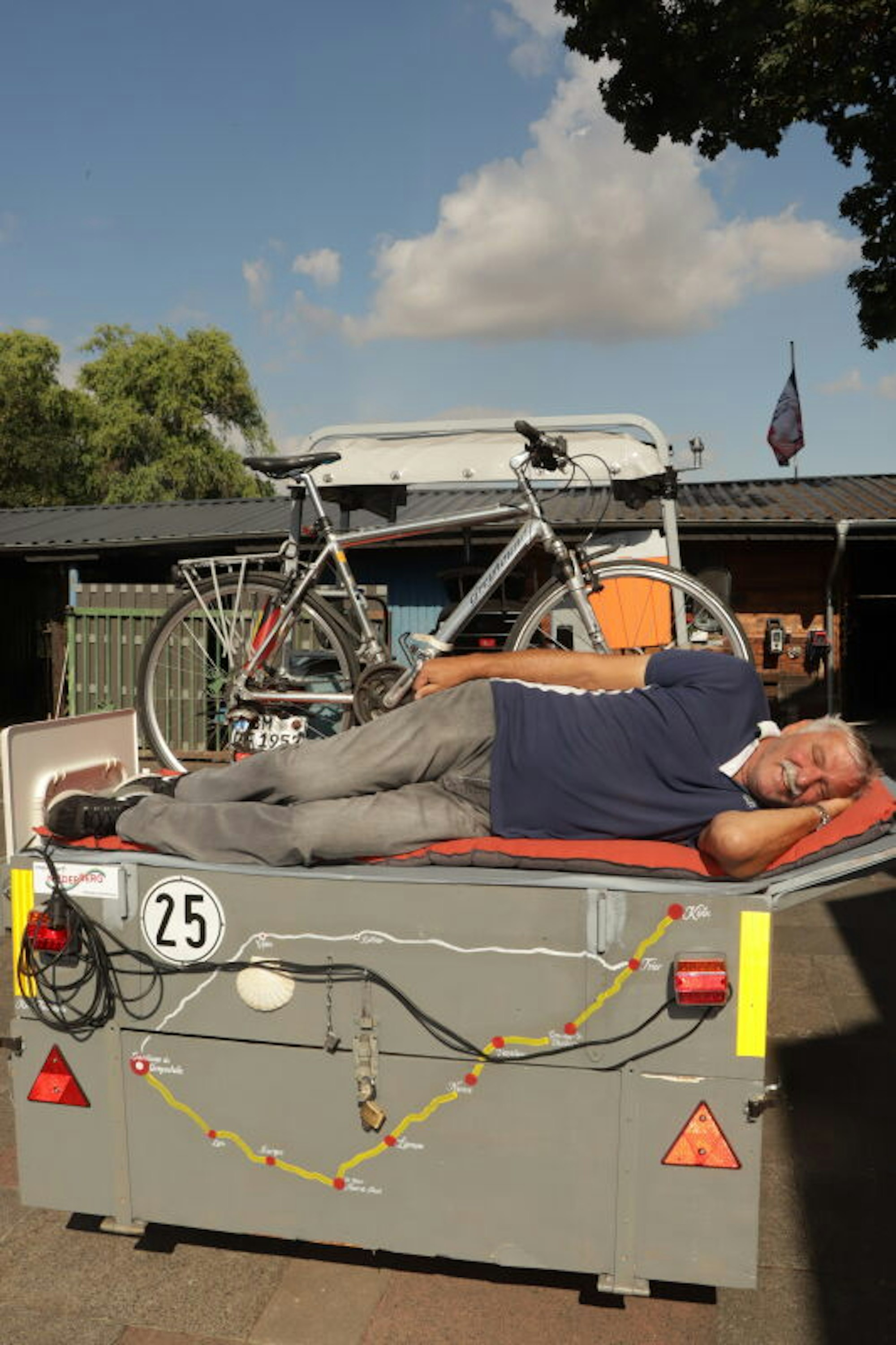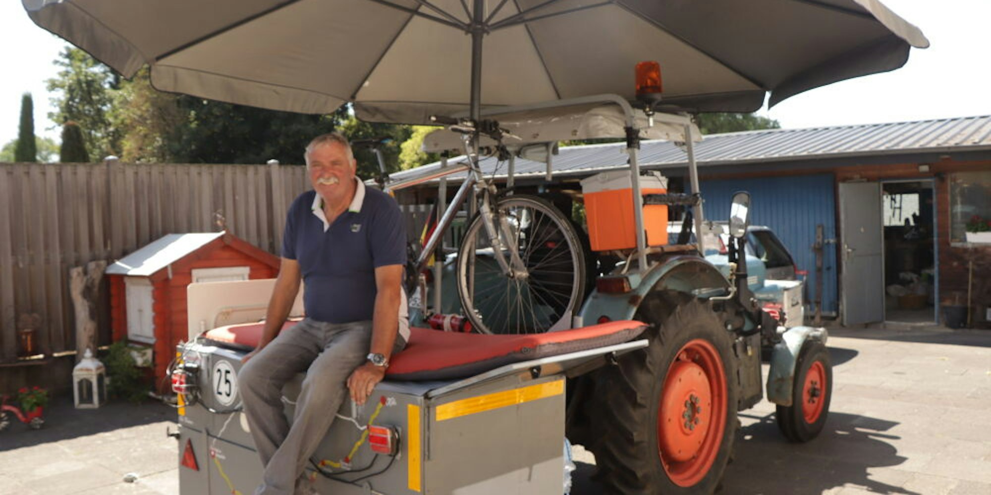 Auch bei der Konstruktion seines Campingaufbaus am Heck des Schleppers hat Sahm an alles gedacht, selbst an Regen. So kann er einen großen Schirm über der Schlafstätte öffnen. Ein zweiter kleinerer Schirm sorgt für Schatten auf der Außensitzloge. Und sichtbar für den Rest der Welt hat sich Sahm die Reiseroute sogar aufs Heck seines Schlepper-Mobil gemalt. Die gelbe Markierung zeigt exakt die Route, die er quer durchs Land bereits mit seinem Fahrrad gepilgert ist. Auf dem Rückweg wollen die beiden Männer aus Niederberg so lange wie möglich am Meer entlang fahren.