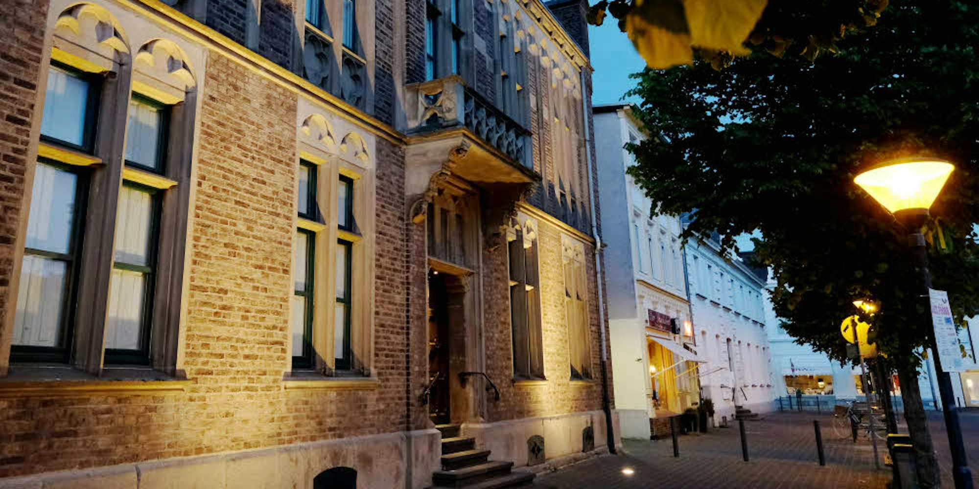 Durch Bodenstrahler und Lampen mit Natriumdampftechnik kommt die neugotische Fassade von Haus Kretz in warmem Licht schön zur Geltung.