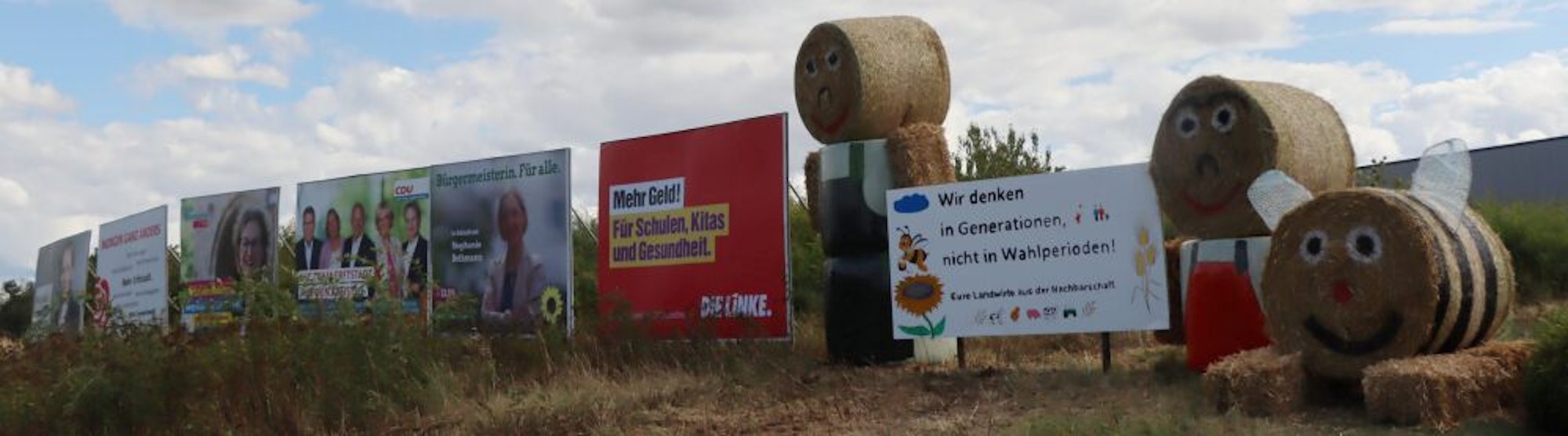 Neben den Wahlplakaten der Parteien haben die Bauern in Erftstadt-Lechenich große Strohfiguren und eine Schrifttafel aufgestellt.
