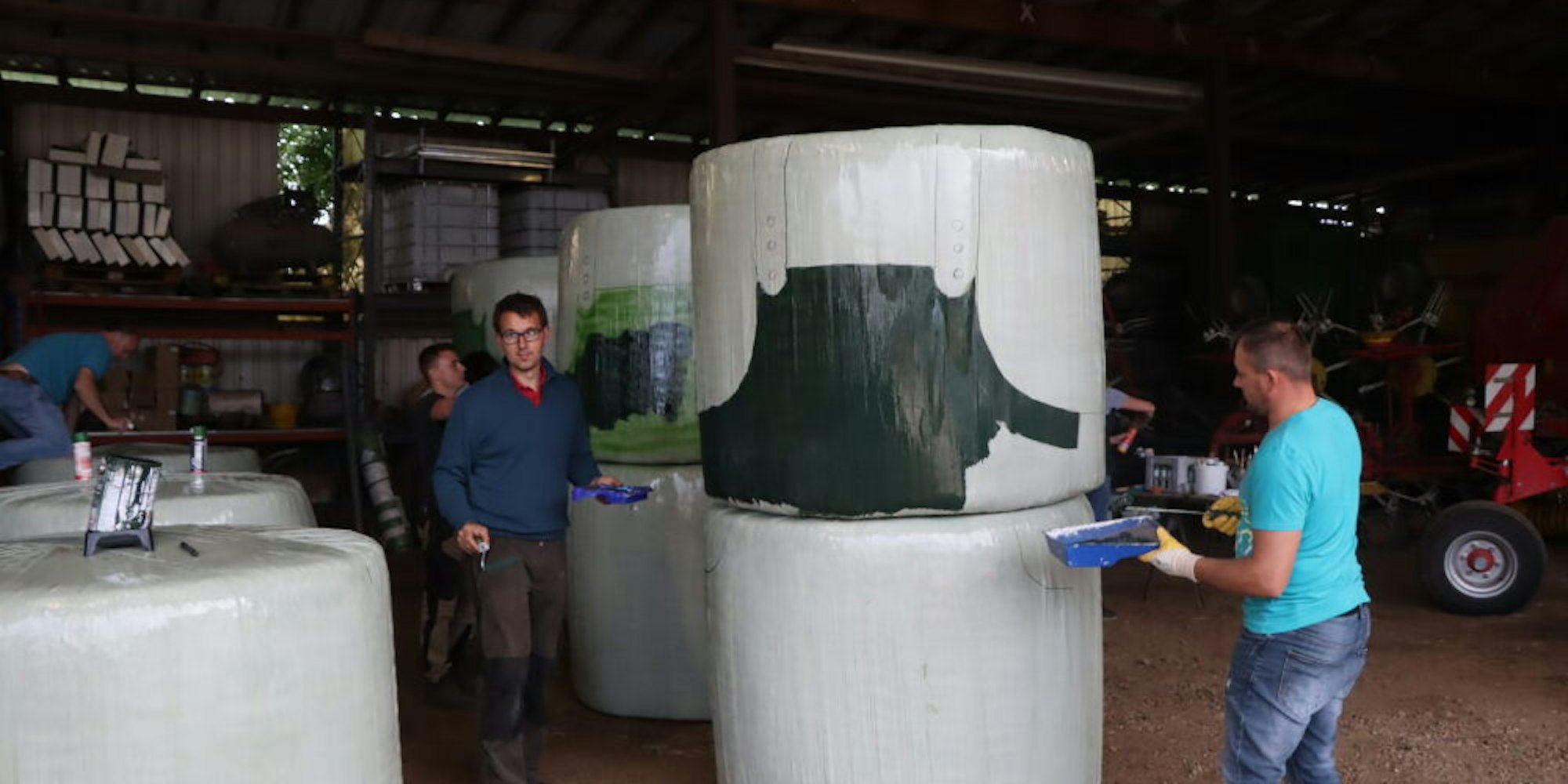Ohne Vorlage und ohne Schablone sprühte Robert Odenthal freundliche Gesichter auf die gut 200 Kilogramm schweren Strohballen. Nebenan strichen Thomas Neiße, Hubert Cöln, Willi Liesenberg, Andreas Haarhoff, Heinrich Esser und Martin Richrath die mit Kunststofffolie überzogenen Strohballen mit Lack an. „Das macht richtig Spaß“, sagte Richrath. Neiße ergänzte mit einem Augenzwinkern, dabei könne man sich künstlerisch ausleben.