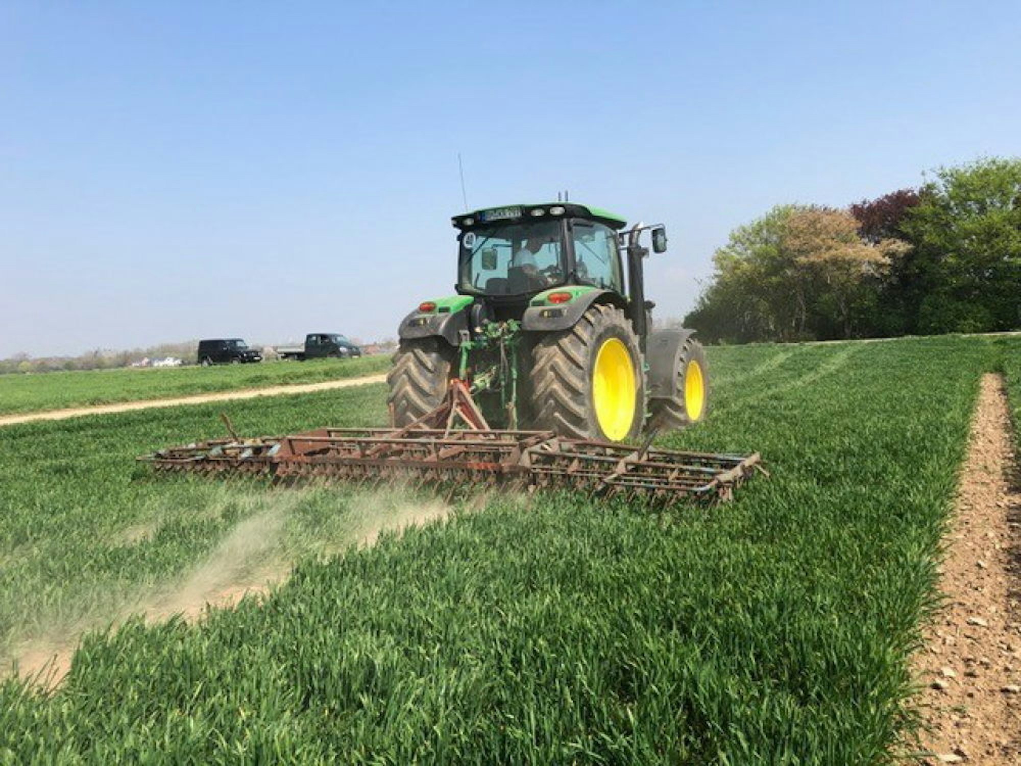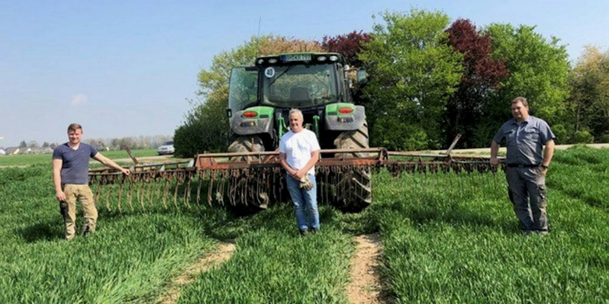 Unkraut aus Weizen striegelnErftgold-Landwirte bei nachhaltigen Getreideanbau