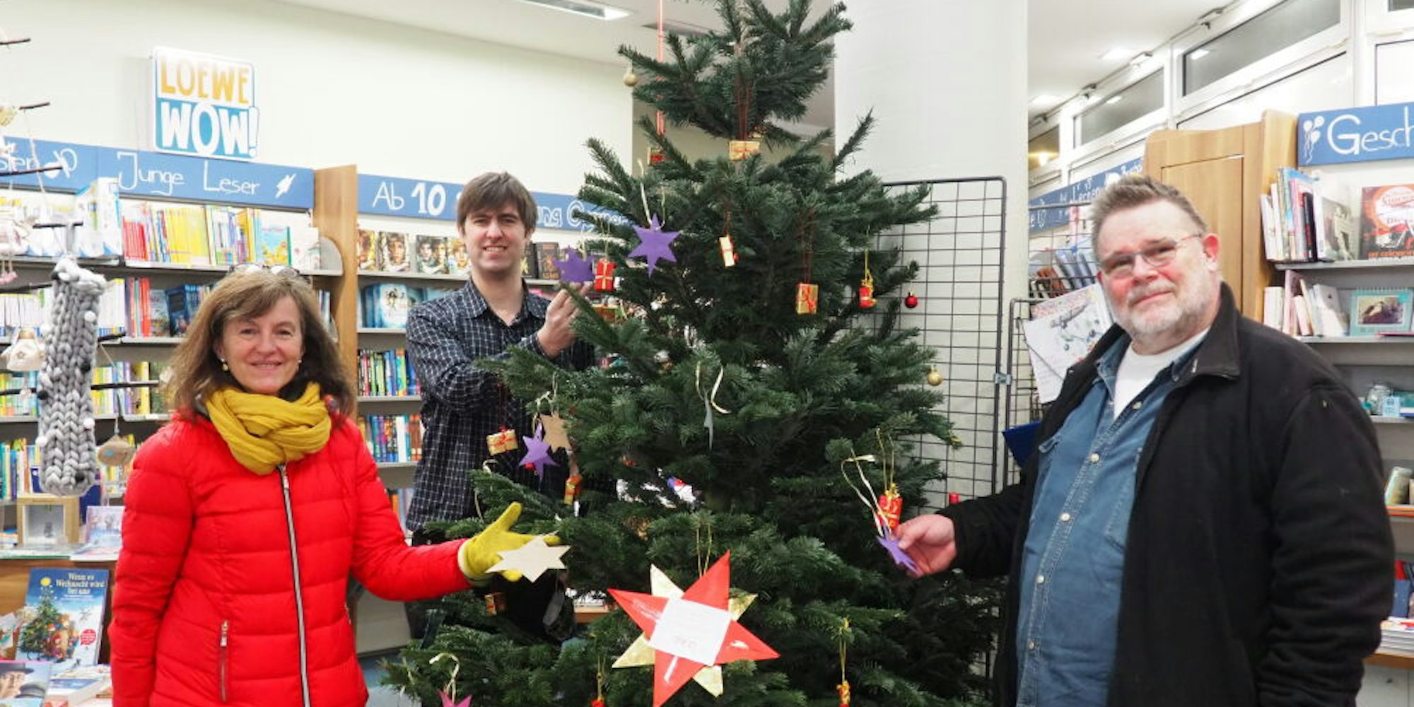 Ute Reichl, Jörg Neuburg von der Buchhandlung Köhl und Manfred Schmelcher haben den Baum geschmückt.