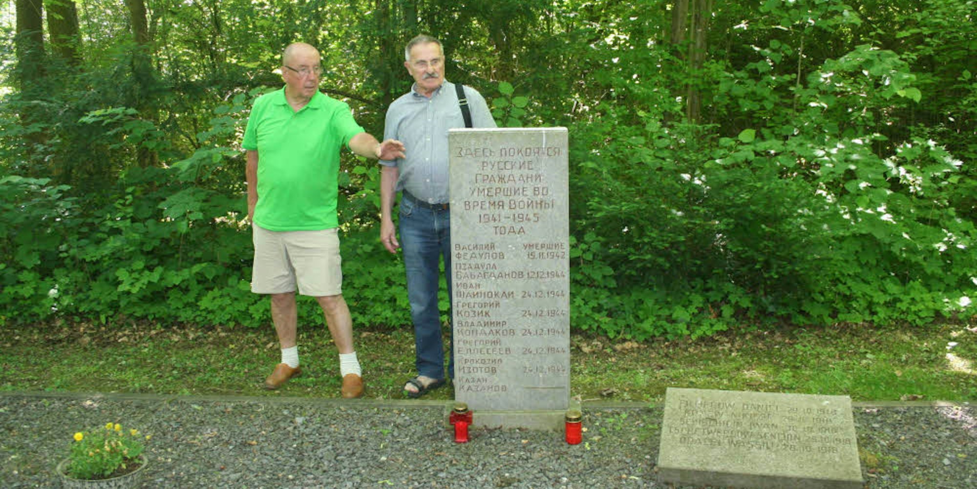 Auch die Gräber für die russischen Opfer aus dem Ersten und Zweiten Weltkrieg sind in der Informationsstele berücksichtigt und gekennzeichnet worden. In kyrillischer Schrift sind auf einem Stein und einer Grabplatte die Namen von 13 Opfern zu lesen. Vertreter des russischen Generalkonsulats haben diesen Ort mehrfach besucht, wie Beißel berichtete.