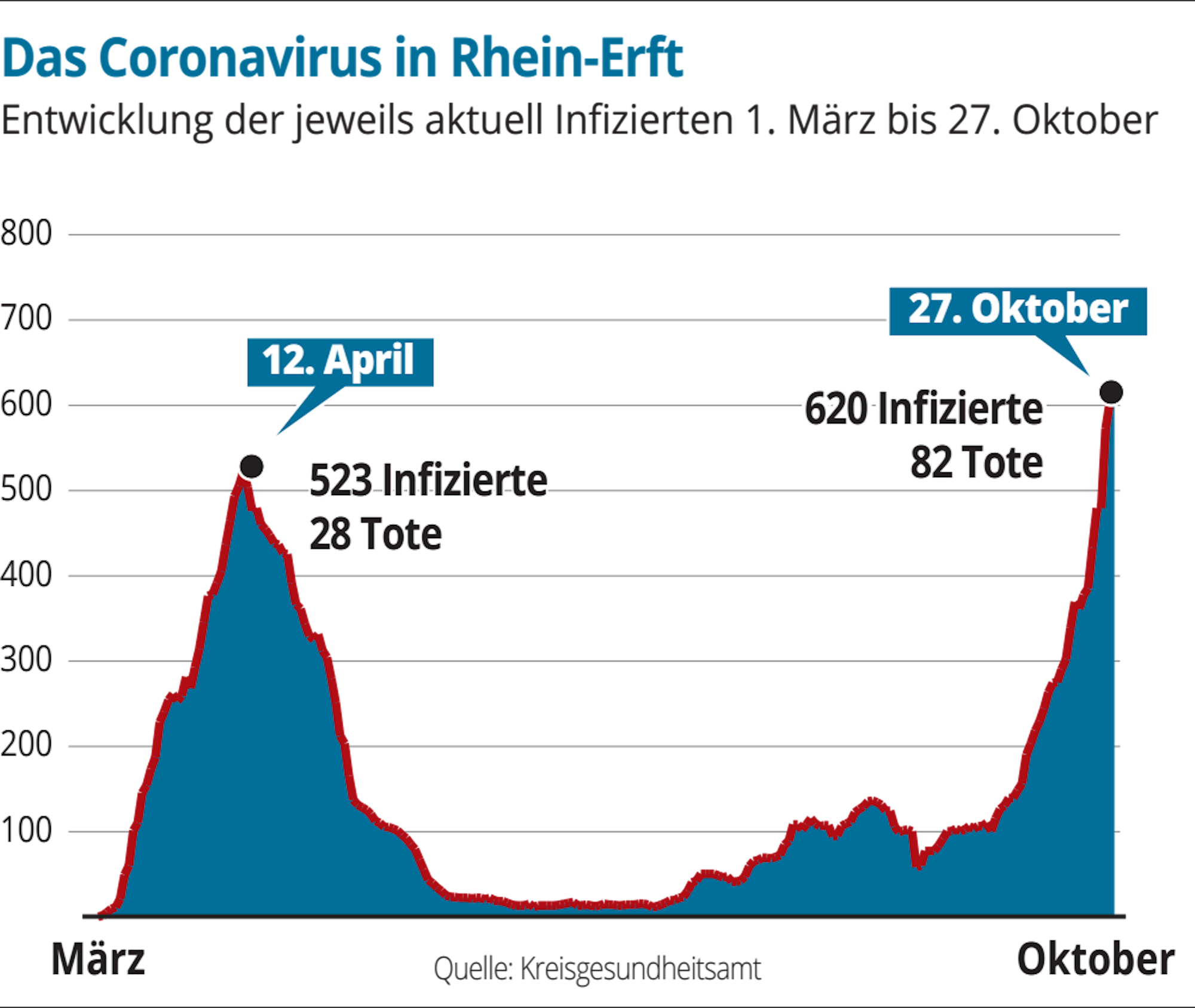 Insgesamt verzeichnet der Rhein-Erft-Kreis weiterhin viele Neuinfektionen. Dem Gesundheitsamt wurden am Dienstag 67 neue Covid-Fälle gemeldet. Insgesamt liegt die Zahl der Corona-Infizierten derzeit bei 620. Die meisten Fälle gibt es nicht zuletzt wegen des Ausbruchs im Altenheim in Frechen. Dort sind laut Kreisverwaltung 113 Menschen mit Corona infiziert.
