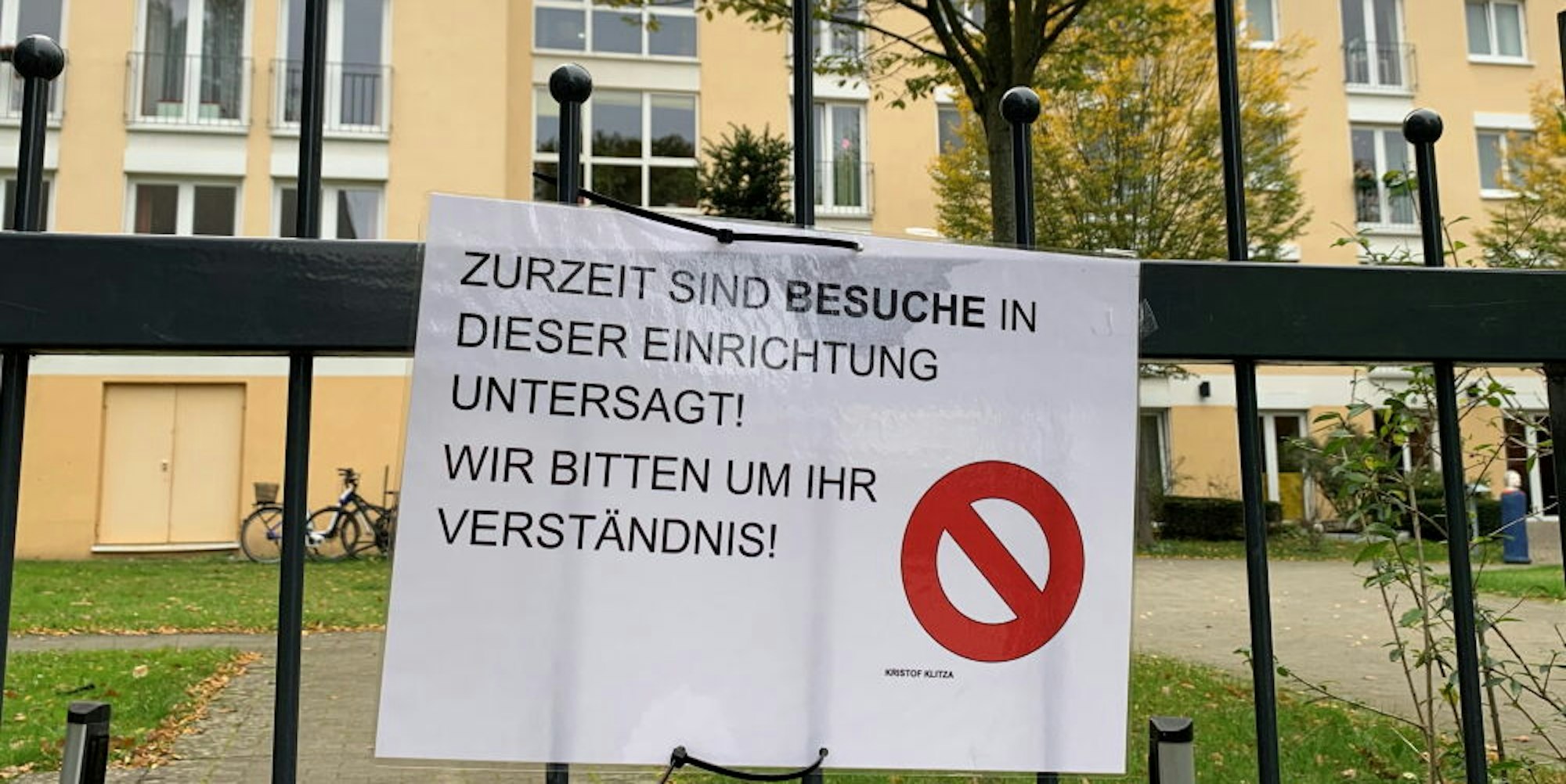 Für das gesamte Seniorenzentrum gilt derzeit ein Besuchsverbot. Ein Schild an der Eingangstür weist darauf hin, dass die Quarantäne-Regelung voraussichtlich bis zum 6. November gilt.