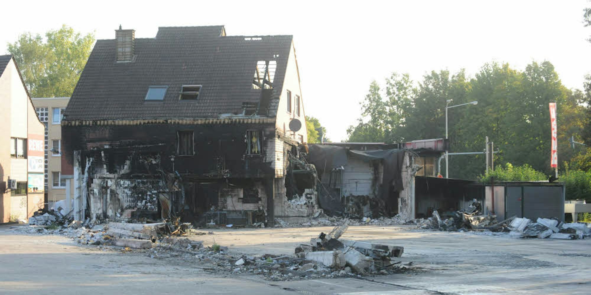 Frechen – Das Abbruchunternehmen hat ganze Arbeit geleistet: Von dem Rewe-Supermarkt an der Hubert-Prott-Straße in Frechen, in dem es am 10. Juni zu einem verheerenden Feuer gekommen war, ist nichts mehr übrig. Das Verkaufsgebäude ist mittlerweile komplett abgebrochen worden. Derzeit steht auf dem Grundstück nur noch ein angrenzendes Gebäude, das durch die Flammen ebenfalls zerstört worden war.
