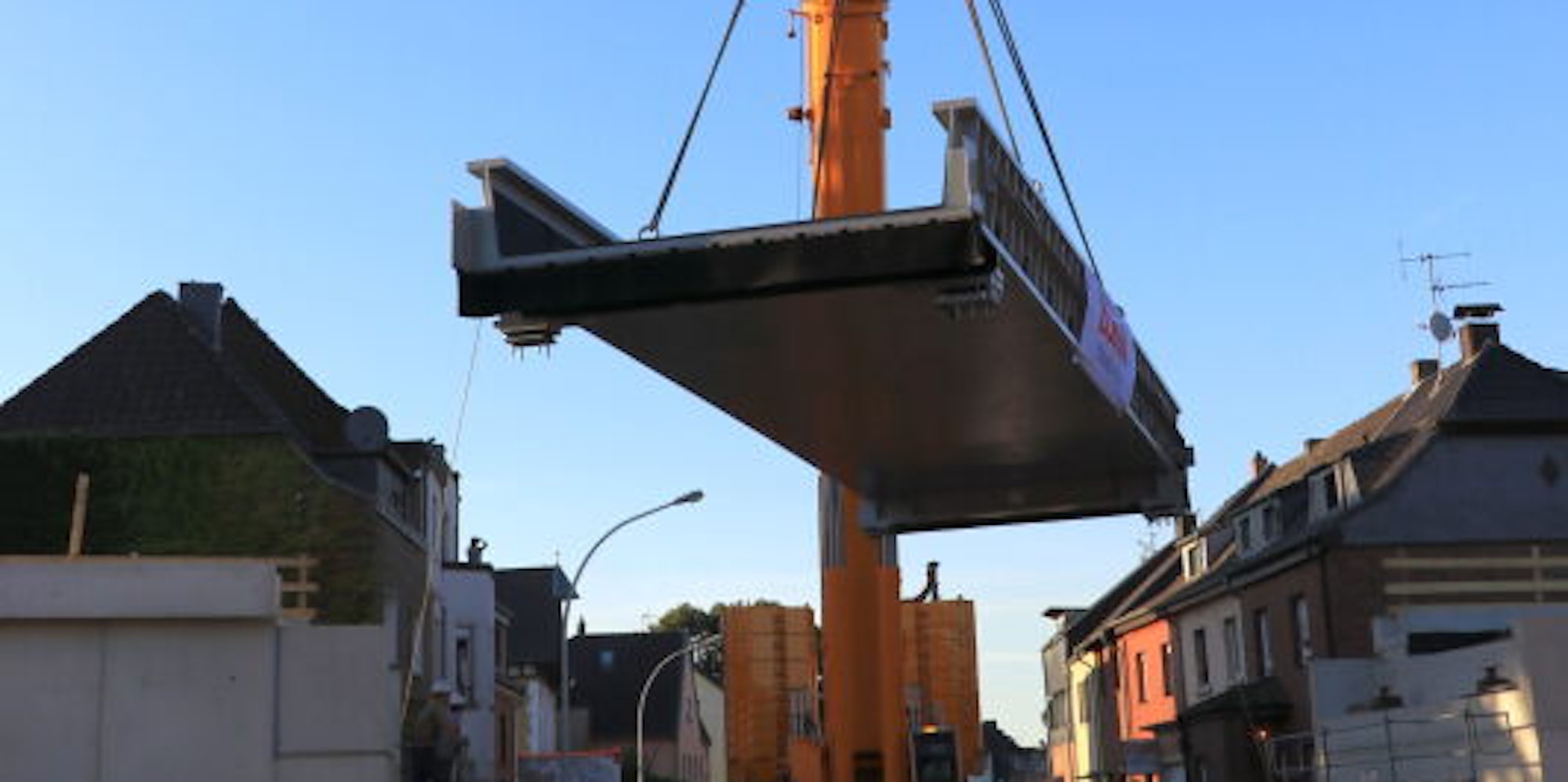 Als der Kran am Morgen aufgebaut und mit rund 90 Tonnen Gewicht beladen wurde, passierte es. Unter einem Ausleger sackte der Boden ein, und eine Trinkwasserleitung, die die Haushalte an der Hubert-Prott-Straße versorgt, ging zu Bruch. Energieunternehmen und Feuerwehr wurden gerufen, um den Schaden zu beheben, ein Gutachter musste ran, um festzustellen, wer einen Fehler gemacht hatte. Erst gegen Abend konnte der Autokran, der erst seinen dritten Einsatz hatte, wieder mit seinen Gewichten bestückt werden, um die 99 Tonnen schwere Bahnbrücke anzuheben und einzuschwenken, damit sie in die Lager eingepasst werden konnte. Dabei war nicht nur das Gespür des Kranführers gefragt, der über Funk seine Anweisungen erhielt, auch Muskelkraft war vonnöten, denn an einigen Stellen hakte es doch und so wurden Brechstange und schwere Hammer eingesetzt, um die Schrauben einzuführen.