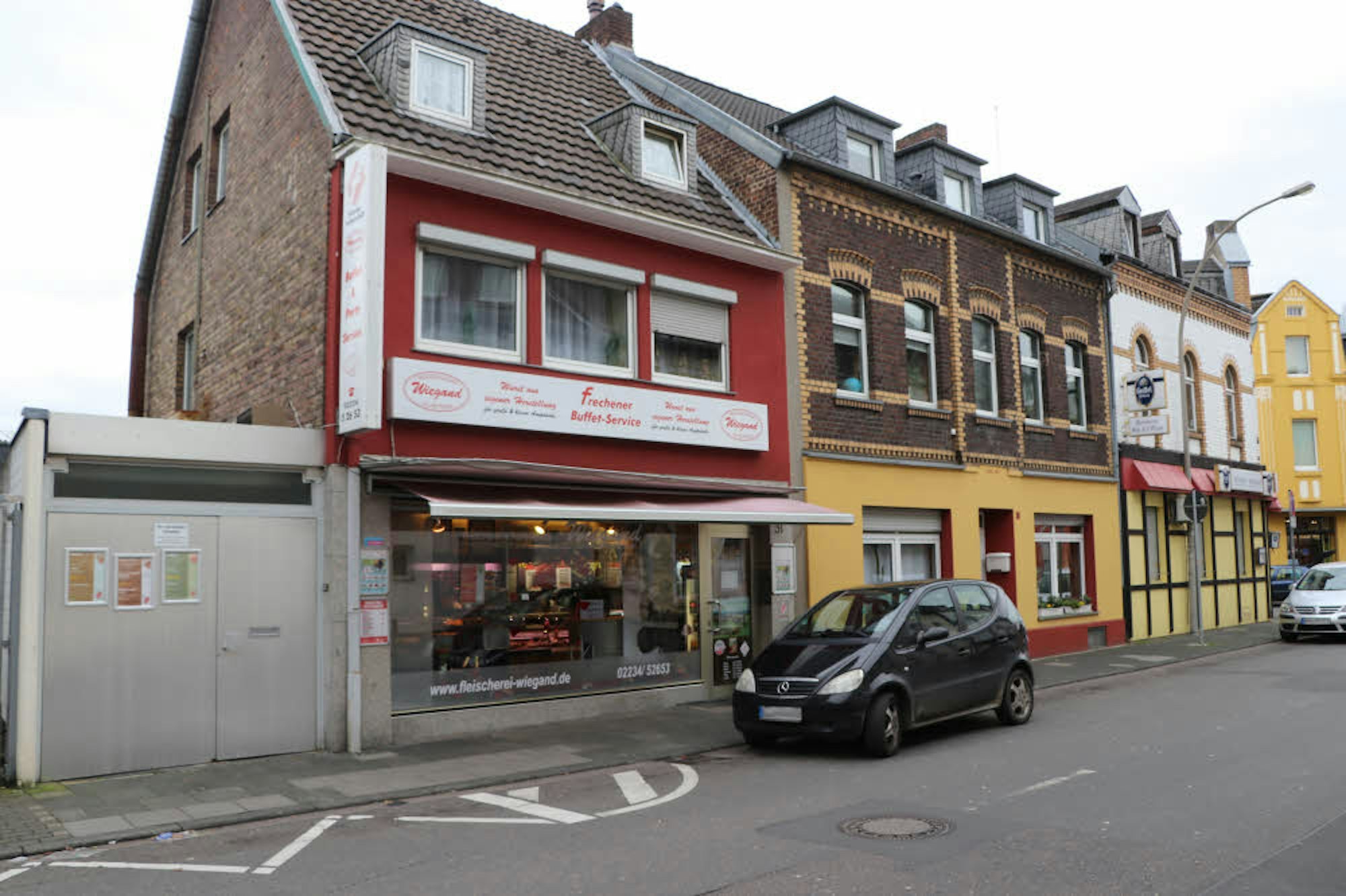 Schon bald machte sich der Vater nach Frechen auf, um das ausgebombte Haus in Augenschein zu nehmen, das durch eine lange Holzbretterwand abgesperrt war. Wurstküche, Schlacht- und Kühlhaus sowie der Schuppen waren verschont geblieben. Hans-Jakob Wiegand: „Das Haus rechts von unserem Trümmergrundstück, die Nummer 29, gehörte der Familie Engel. Da war mal ein Kolonialwaren- und Textilgeschäft drin, die Räume standen seit langem leer. Meinem Vater kam die Idee, dort wieder eine Metzgerei zu eröffnen.“ Das klappte 1946, die Familie mietete das Ladenlokal sowie die dazu gehörende Dreizimmer-Wohnung für monatlich 80 Mark. Schnell wurden Handwerker mobilisiert, die in der Zeit gern bei einem Metzger arbeiteten, wurden sie doch in der Regel in Naturalien, mit Wurst, Speck, Schmalz und Schinken, bezahlt.