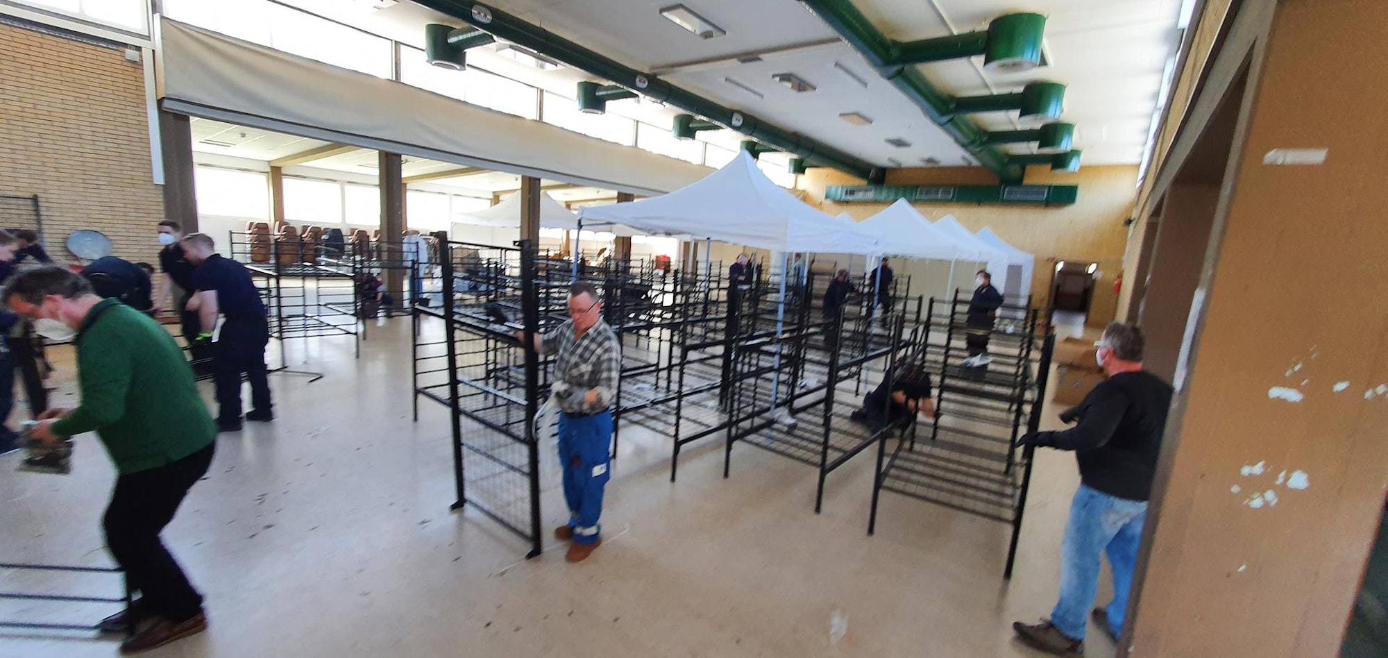 20 Helfer beteiligten sich am Aufbau der Betten und Zelte in der Habbelrather Willi-Giesen-Halle.