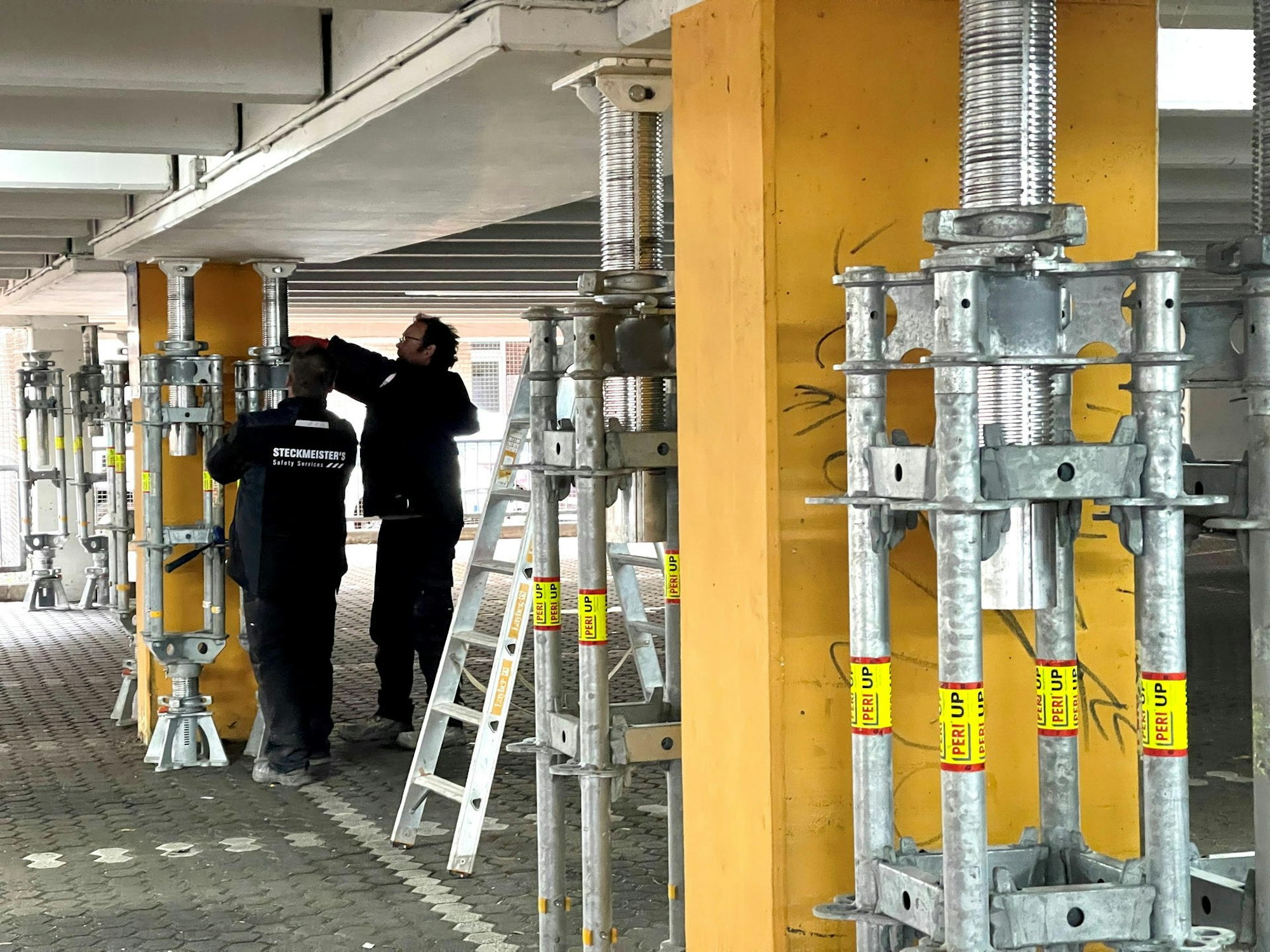 Die Arbeiter errichteten die Schwerlaststützen im Erdgeschoss und im darüberliegenden Parkdeck.
