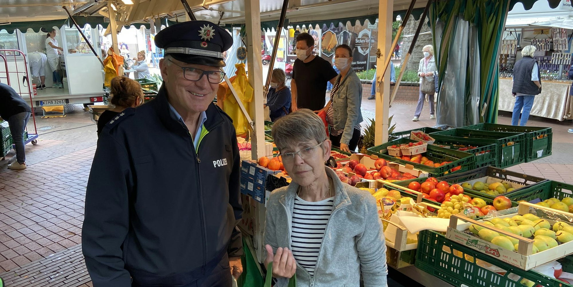 Frechen – Mit einem Vorwand lockten die Händler den Polizisten Hajo Pütz auf den Frechener Wochenmarkt: „Es gibt hier Ärger“, hatten sie ihn wissen lassen. Der Ordnungshüter eilte zu den Marktständen in der Fußgängerzone, doch dort wurde sehr bald deutlich, dass er einer Finte aufgesessen war. Die Marktleute wollten sich von „ihrem“ Polizisten verabschieden.