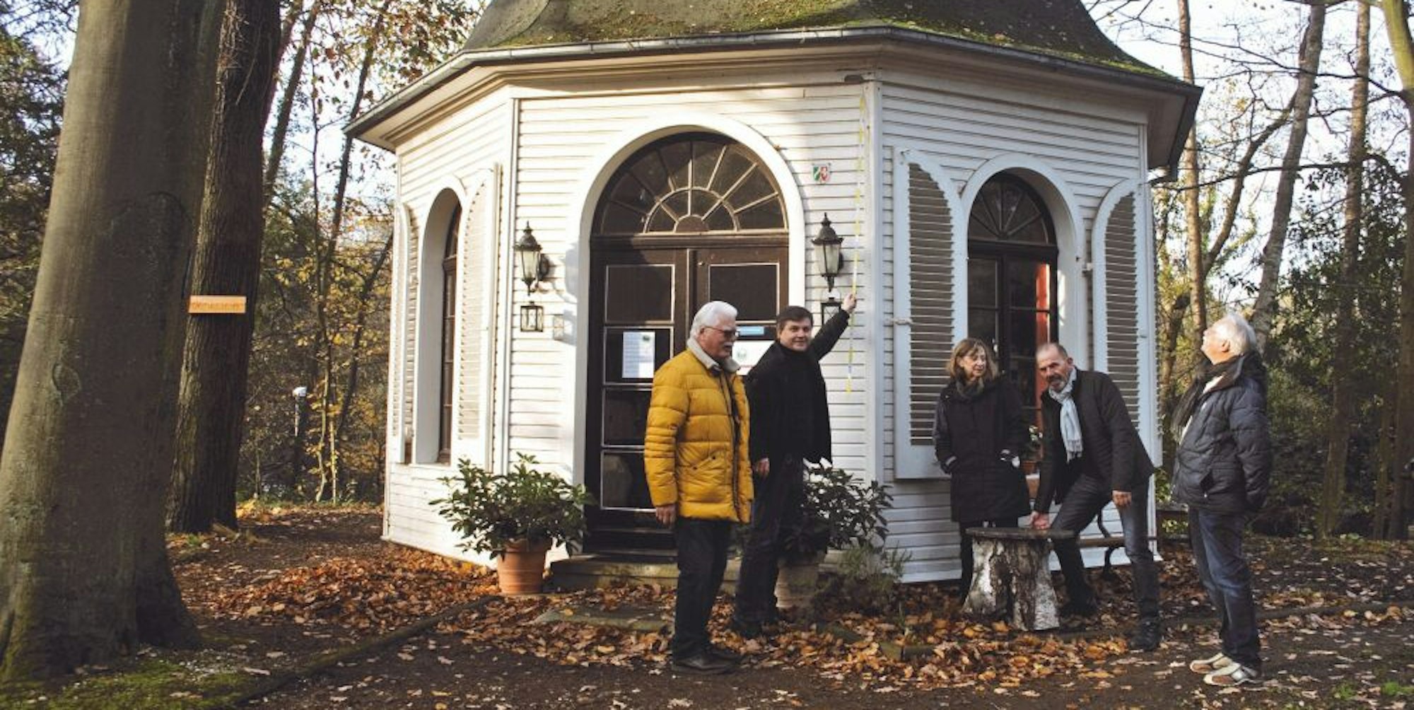 Einige Aktive der Gruppe, namentlich Joachim Hornkohl, Kristof Klitza, Anne Brendel, Hans-Bert Quath und Wilfried Kaulen (v. l.) , haben sich am Kardinal-Schulte-Pavillon versammelt.