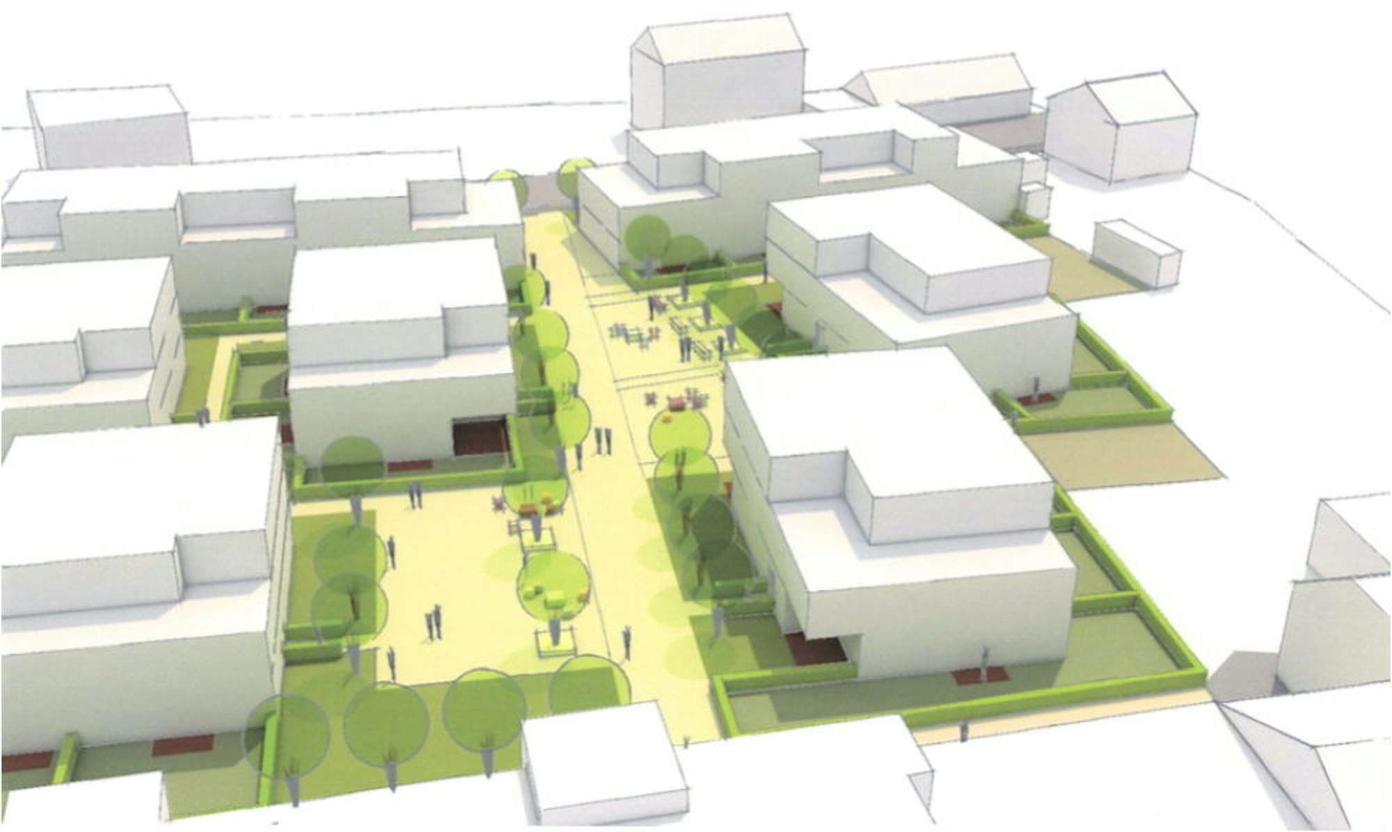 Nach der Idee der Planer soll hier, wo derzeit Fahrzeuge rund um mehrere Hallen parken, moderner, attraktiver Lebensraum mit zeitgemäßer Architektur, Bauweise und smarter Ausstattung entstehen. Hinzu kommt eine großzügige Bepflanzung der Außenanlagen. Das Angebot richtet sich an Familien, Paare, Alleinstehende und Senioren. Das neue autofreie Quartier lockt mit Nahwärme vom Blockheizkraftwerk, Photovoltaik und Dachbegrünung. Kinderspielplätze sind ebenso vorgesehen wie Grünflächen und natürlich eine ausreichend dimensionierte Tiefgarage für die Mieter und eventuelle Betriebe im nahen Umkreis. Fahrradabstellplätze sollen ebenfalls geschaffen werden.