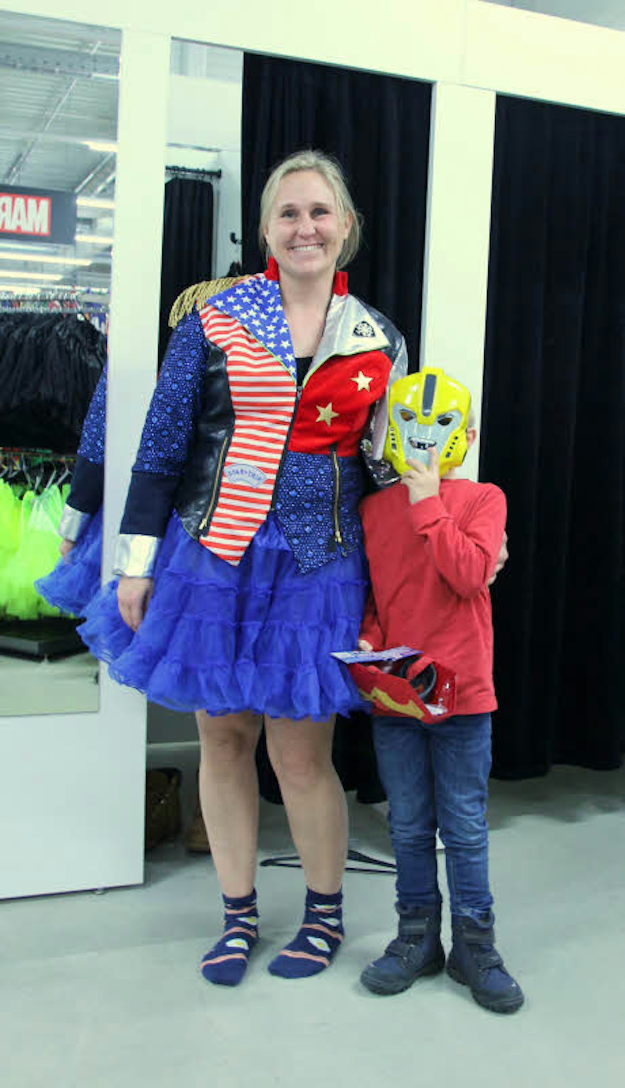 Monika Nölke trägt eine jecke Trend-Jacke, ihr Sohn Ferdinand geht als Bumblebee.