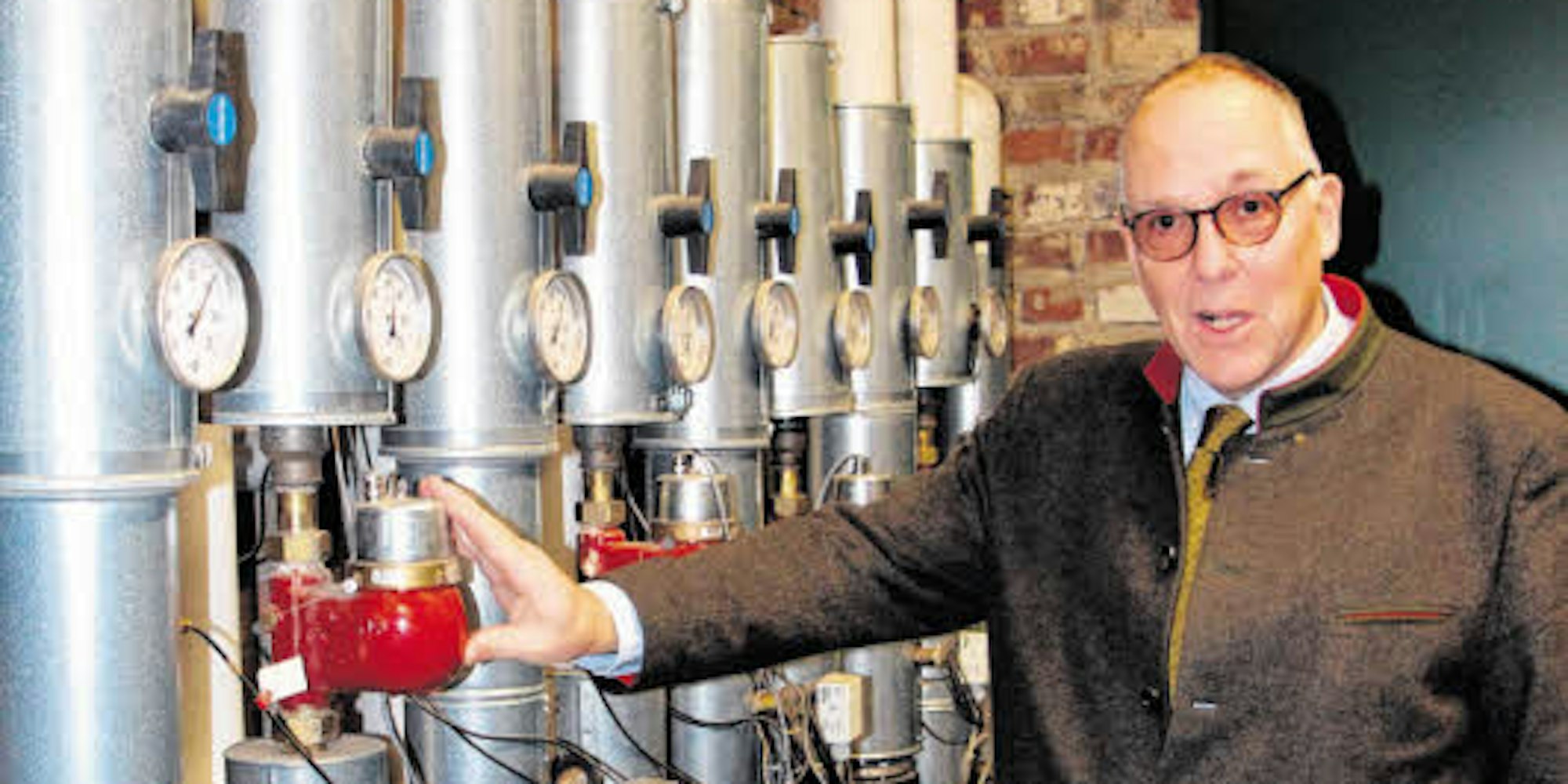 Cornel Lindemann-Berk, Inhaber des Guts Neu-Hemmerich, zeigt die komplexe Heizanlage.