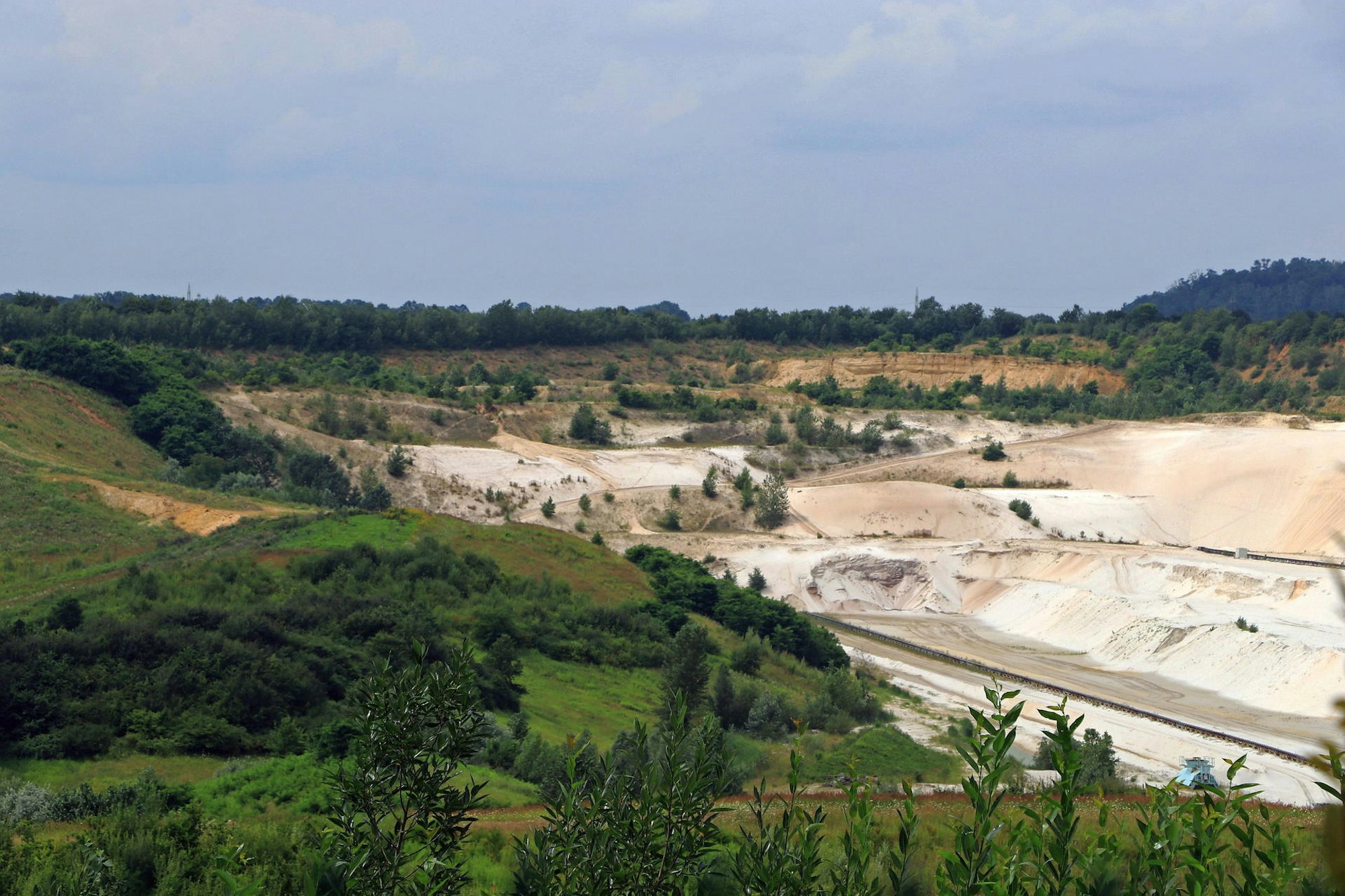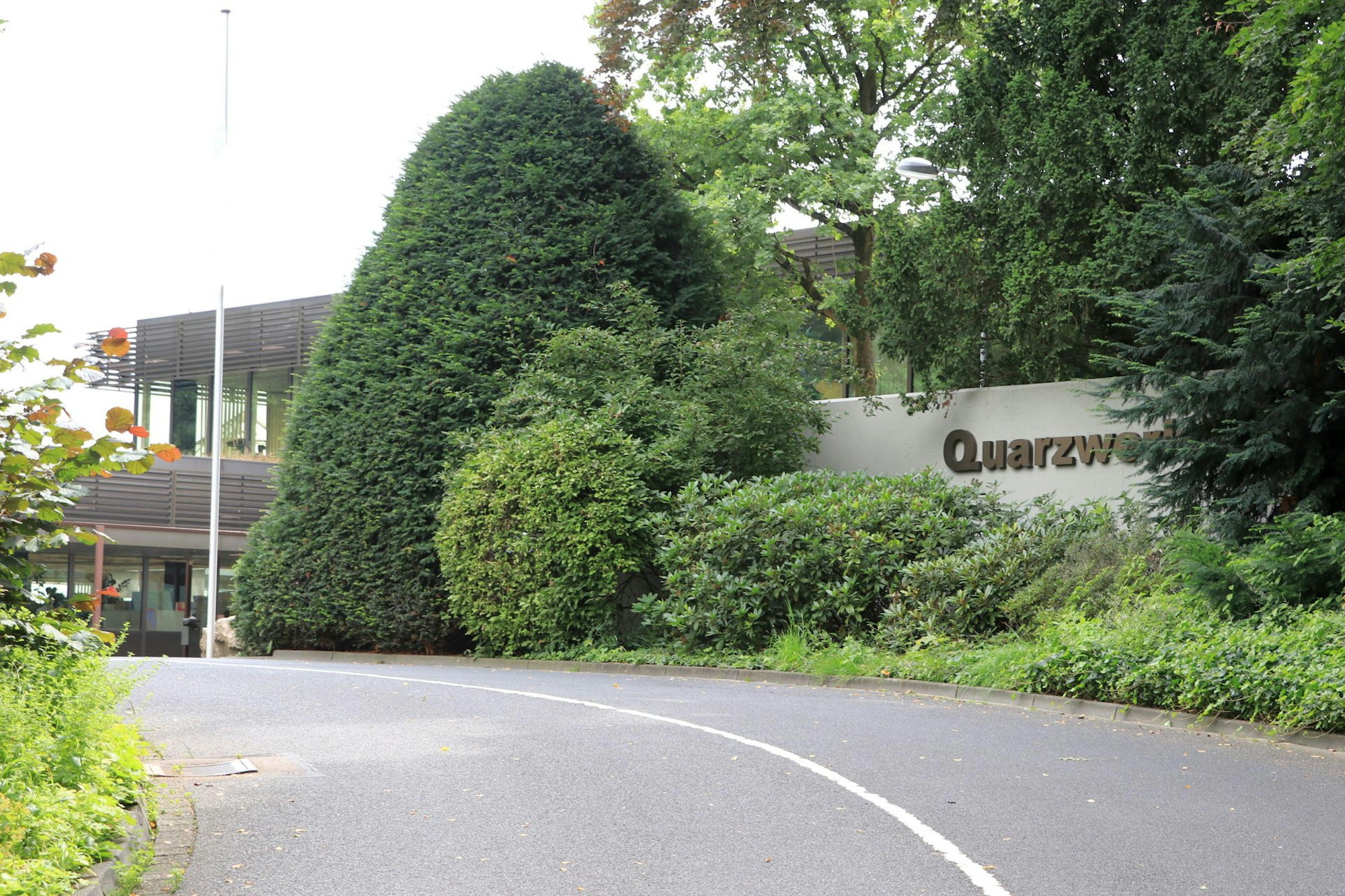 Wir folgen dem schmalen Weg, der uns durch den recht verwilderten Park führt. Rechts liegt der kleine Fußballplatz, links eine inzwischen verwilderte eingezäunte Sportfläche, auf dem der Kickernachwuchs vor der Pandemie seine Spiele austrug. Nach ein paar hundert Metern stoßen wir auf einen ansteigenden asphaltierten Weg, auf den wir nach links abbiegen. Kurz darauf öffnet sich vor einer Ruhebank ein Weg nach rechts, der unterhalb der Hauptverwaltung der Quarzwerke durch die Grünanlage führt.