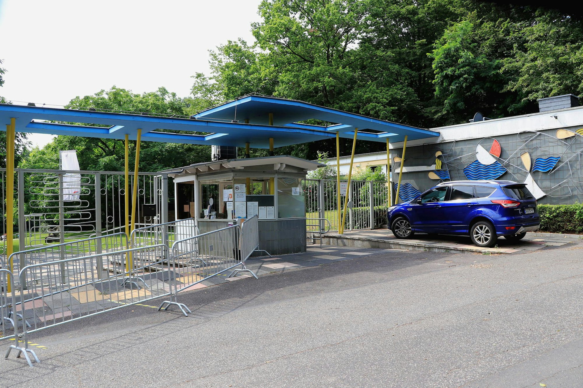 Vorbei am Parkplatz wenden wir uns nach links in den Hans-Schaeven-Weg und wandern vorbei an den Umkleideanlagen der Fußballer hoch zum Terrassenbad (Bild 3), dessen Anlagen nicht nur die Frechener seit 1958 zu schätzen wissen. Am Gittertor des Eingangs hängt ein Schild, von dem wir den fünften Buchstaben des Wortes in der dritten Reihe notieren.