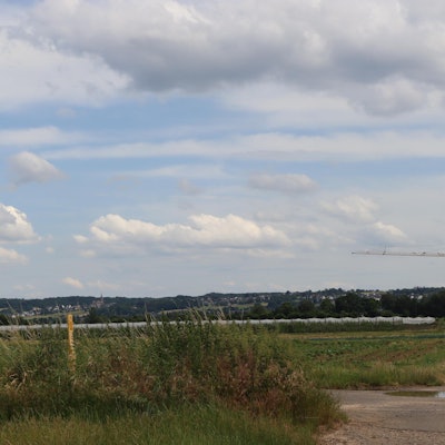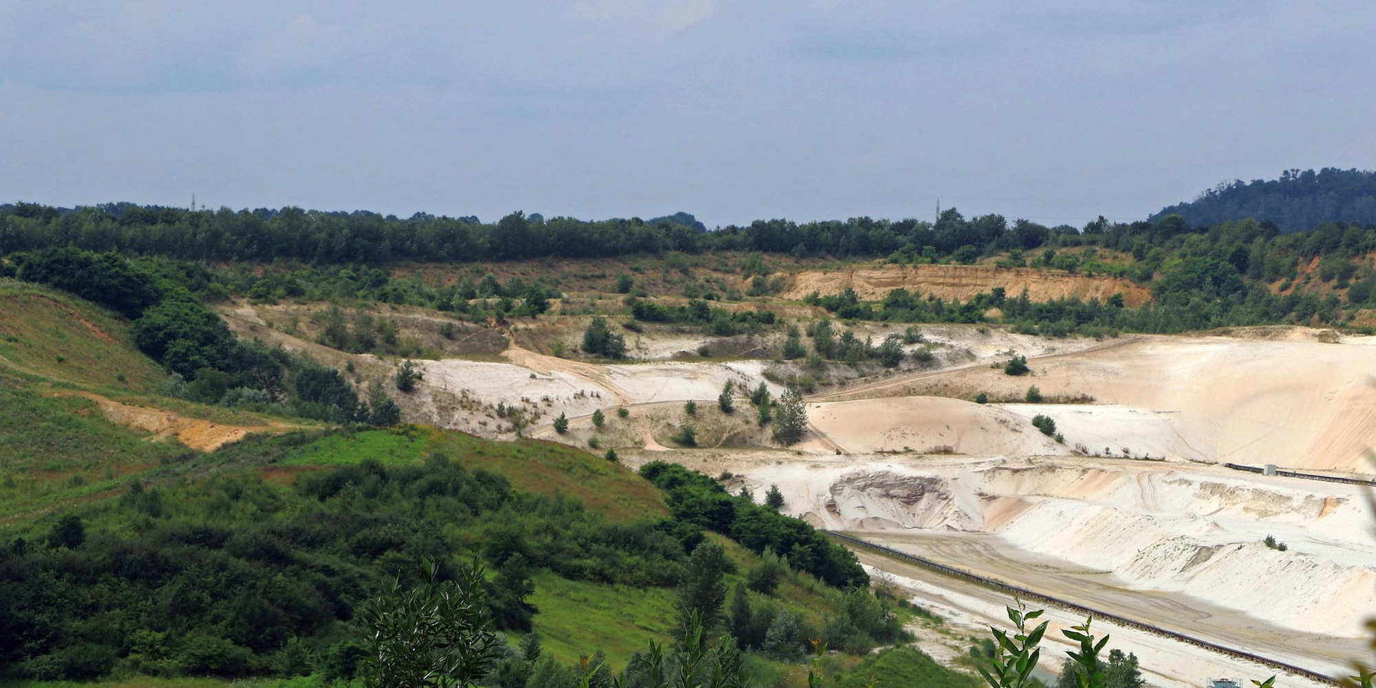 Wir verlassen den Parkplatz und gehen nach links hoch zum Aussichtspunkt, der uns einen Blick in das Abbaugebiet (Bild 6) erlaubt. Ist linker Hand die Renaturierung weit fortgeschritten, so sieht man auf der rechten Seite die Bagger beim Abbau des begehrten Sandes. Auf der rechten Seite lag früher der Sportflugplatz, der von 1961 bis 1991 ein Eldorado für Segelflieger war, die die Thermik über der Quarzsandgrube nutzten. Viele Frechener werden sich auch noch an die Flugtage und –schauen erinnern. Höhepunkt war 1977 der Flugtag zur 1100-Jahrfeier Frechens mit rund 30.000 Gästen.