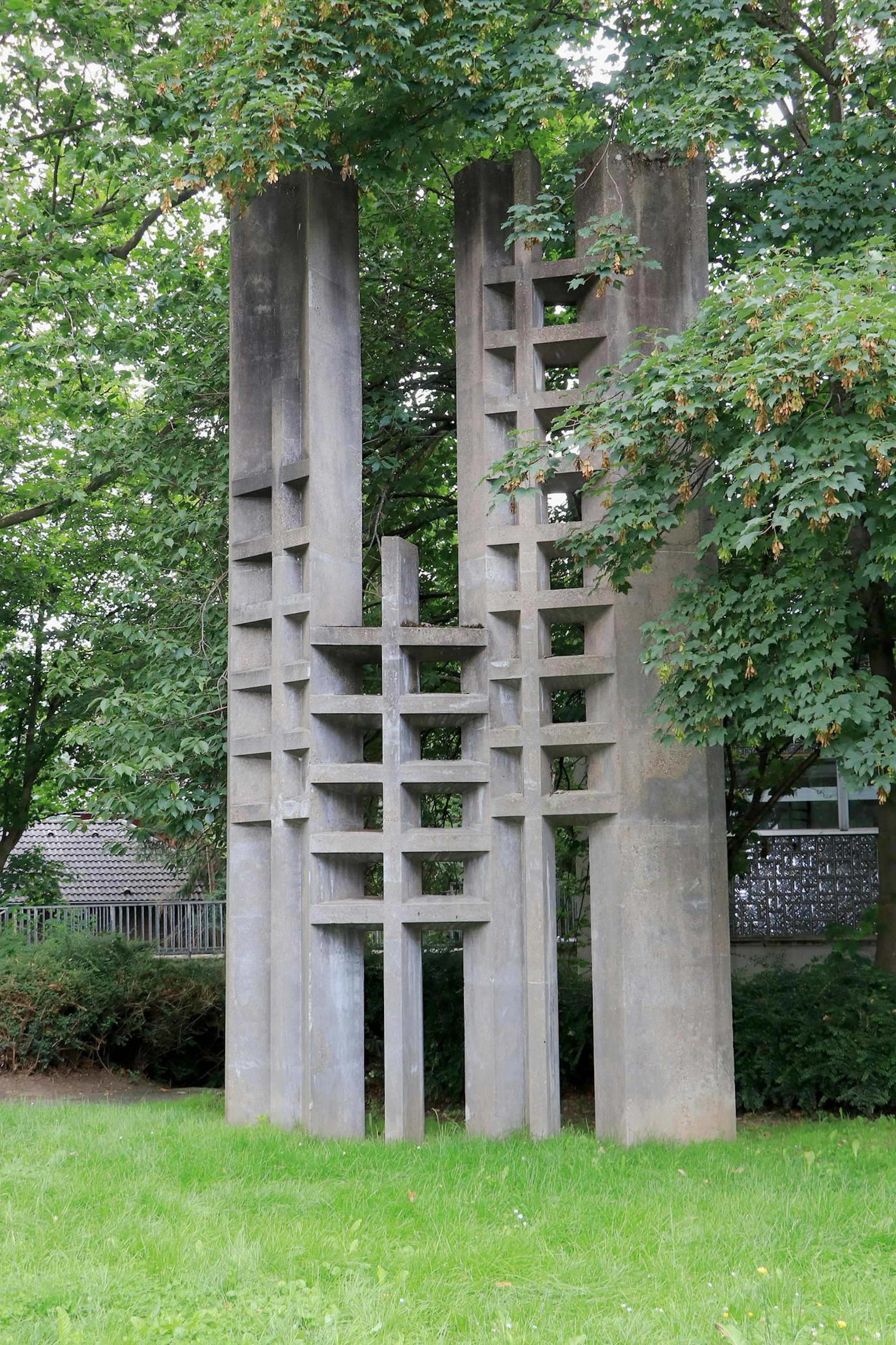 Weiter geht es, und wir folgen der nächsten Abbiegung nach rechts. Vorher aber schreiben wir noch den drittletzten Buchstaben des Straßennamens auf. Vorbei am Sitz der Frechener Tafel, der Rückseite der Realschule und dem Internationalen Bund auf der rechten Seite stoßen wir an der Kreuzung mit der Straße zum Sportpark auf eine große Betonskulptur (Bild 9), die der Künstler Professor Rolf Crummenauer Mitte der 60er-Jahre entworfen hat.