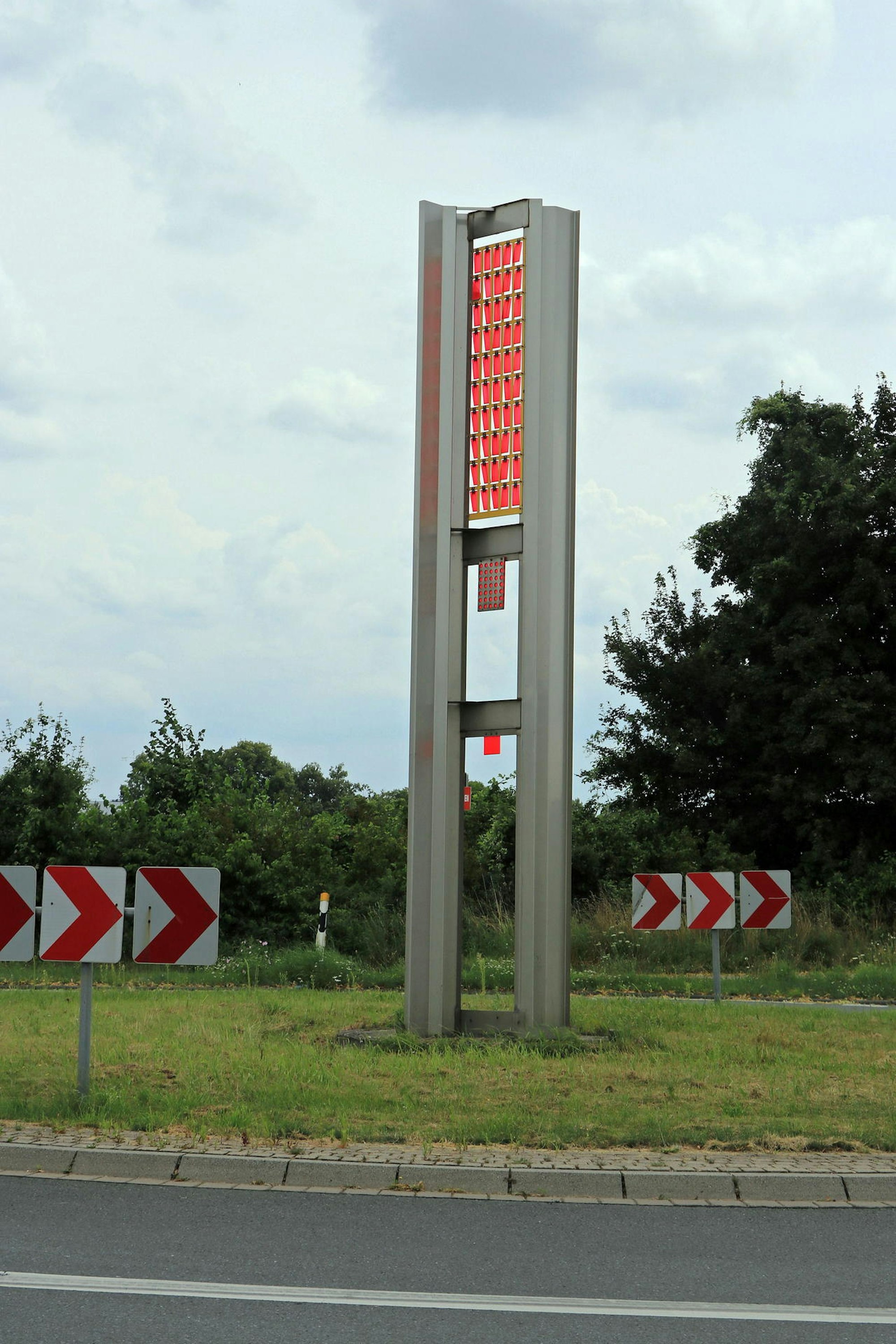Wir marschieren über den Kaskadenweg hinunter in Richtung Stadt. Am ersten Kreisel stoßen wir auf die Ortsumgehung Buschbell, und vom dortigen Straßenschild schreiben wir den fünften Buchstaben des Familiennamens auf. Beim Marsch rechts in Richtung Lindenstraße schweift der Blick über Frechen und das St.-Katharinen-Hospital, und im Dunst erkennen wir die Silhouette Kölns. Am Kreisel mit der markanten rot-weißen Skulptur (Bild 7) überqueren wir die Straße und stoßen auf ein Hinweisschild zu den Werksanlagen, die wir gerade passiert haben. Hier ist der neunte Buchstabe in der letzten Reihe wichtig.