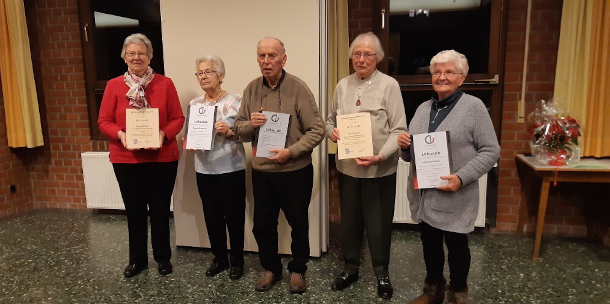 Renate Bestgen und Christina Offizier sind seit 25 Jahren dabei, Annemarie Görtz und Margret Bahlmann seit 40 Jahren. Gerhard Görtz blickt sogar auf 65 Jahre im Chor zurück. Für ihre Treue erhielten die Jubilare Urkunden und Ehrenzeichen des Sängerkreises Rhein-Erft.