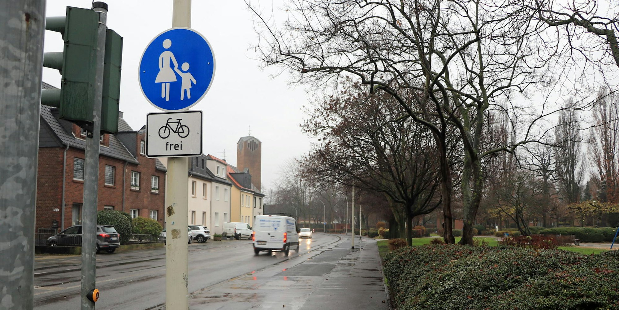 Den Gehweg an der Hubert-Prott-Straße in Frechen dürfen Radfahrer und Fußgänger derzeit gemeinsam nutzen.