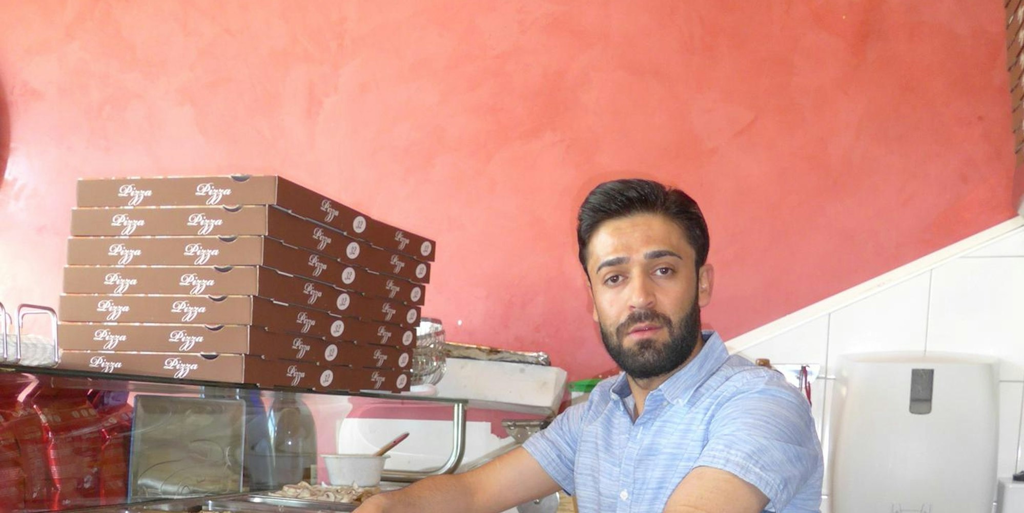 Pizzabäcker Richie aus dem Restaurant Mamma Leone in Erftstadt stellt eine Lieferung zusammen.