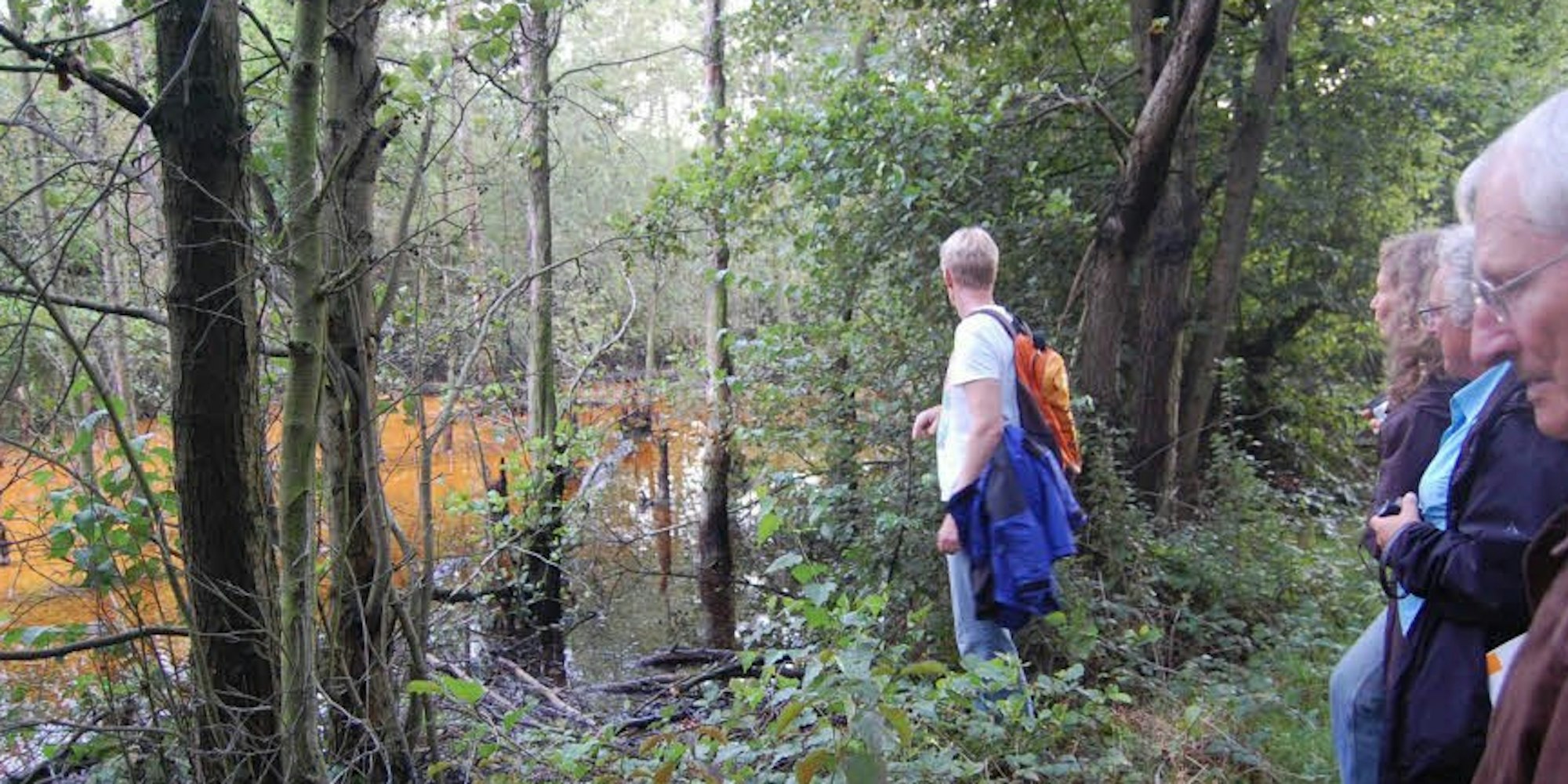 Rotes, mit Schwermetallen belastetes Wasser tritt bei Türnich aus der Berrenrather Börde aus, wie hier die BUND-Ortsgruppe Kerpen bei einer Informationswanderung den Teilnehmern zeigt.