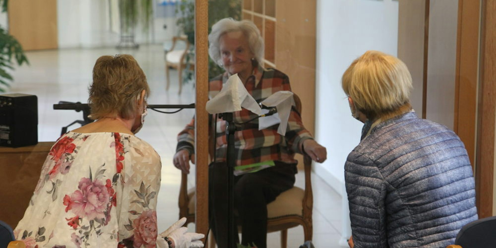 Eine Plexiglasscheibe trennt Heimbewohnerin Thea Rensing (Mitte) in Lohmar von ihren Töchtern Iris Rensing (links) und Petra Rink, die ihr zum 86. Geburtstag gratulierten.